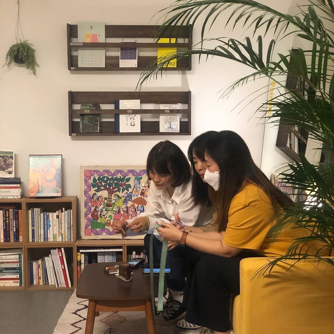 공간을 구성하며 가장 기다렸던 순간은 바로 책을 꼽는 시간이었다. 희대표의 책과 내 책들로 공간을 채우고, 몇몇을 골라 북 선반에 따로 꼽아 두었다. 명색이 큐레이션 북살롱답게 '이달의 희희 추천도서'를 해나갈 셈이다. 재고가 없는데 버젓이 상품을 올려놓아 몇 주를 애먹은 문제의 소파 대신(공간을 꾸리느라 무언가를 사다보면 이런 일로 콧바람 내뿜을 때가 있다.), 친절왕 기사님이 배송해 주신 안락한 페브릭 소파도 자리를 잡았다. 책에 손이 잘 닿는 곳, 거울을 통해 공간희희를 한 번에 볼 수 있는 곳에 희희를 닮은 노오-란 소파가 있다.