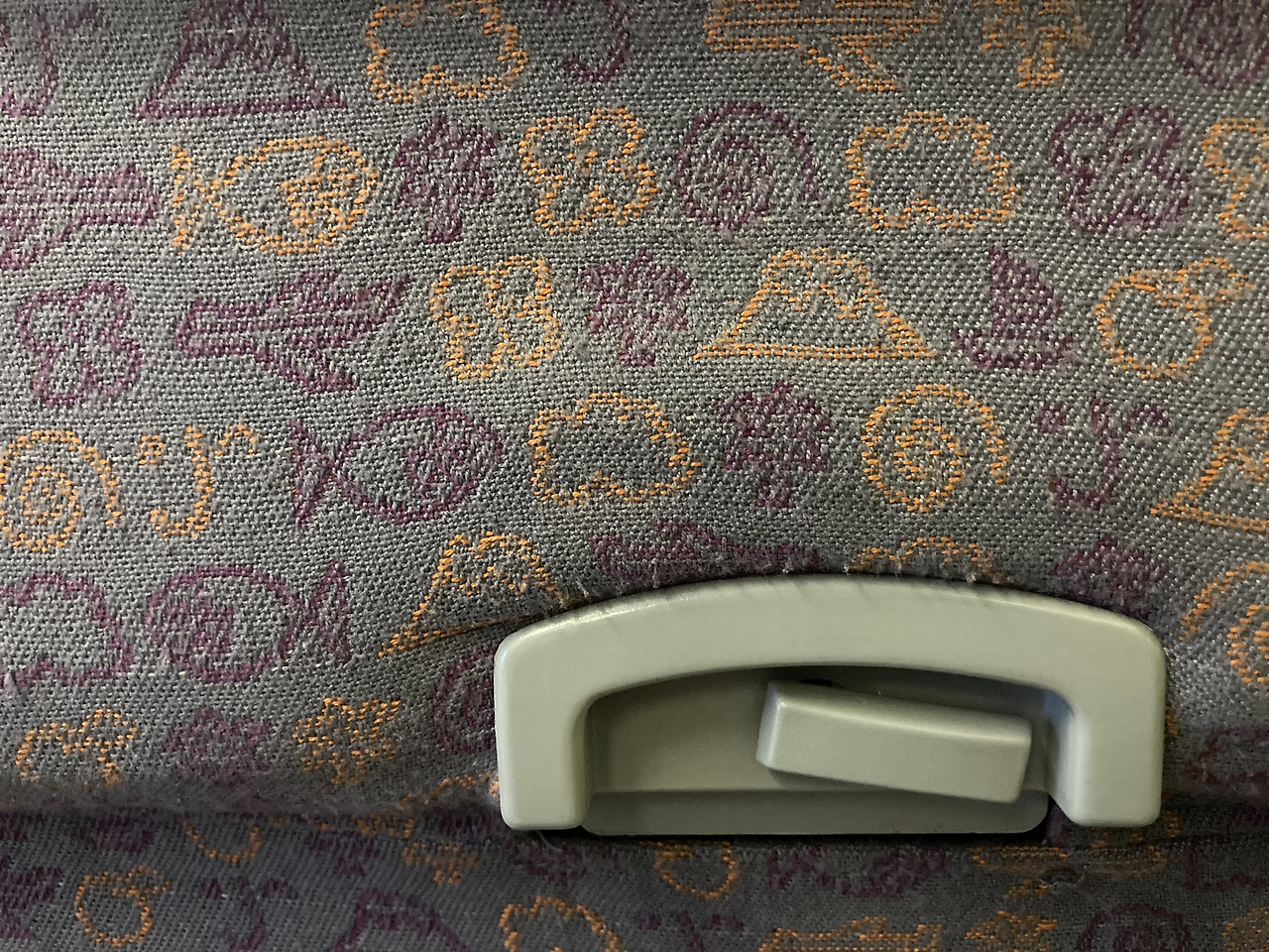 눈을 안전지대로 옮겨 의자를 관찰한다. ‘비행기 좌석에 무엇이 그려져 있는지~~ 까지 살필 수 있는 시간과 여유가 있는 것이 여행이지. 맞다 맞아!’를 외친다. 제주로 가는 제주 항공 의자에는 비행기, 야자, 귤, 한라산, 물고기, 배, (여기서부터는 추측)동백꽃, 바람, 구름이 그려져 있었다. 이번 여행 동안 과연 모두를 만날 수 있을지!