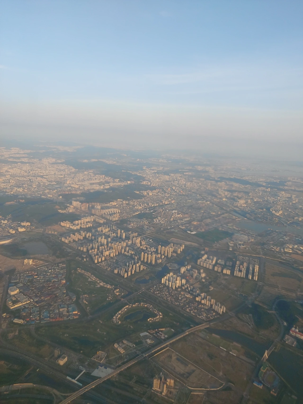 비행기 위에서 내려다보는 도시는 기이하다. 장난감 블럭 같은 아파트가 논 밭 곳곳에 심겨 있다. 이 아파트 공화국 속에 그나마 전답(田畓)이 존재할 수 있는 건 그나마 비행기라도 떠서인가.(그 가까이로는 집이 들어설 수 없으니) 정답은 모르겠다.