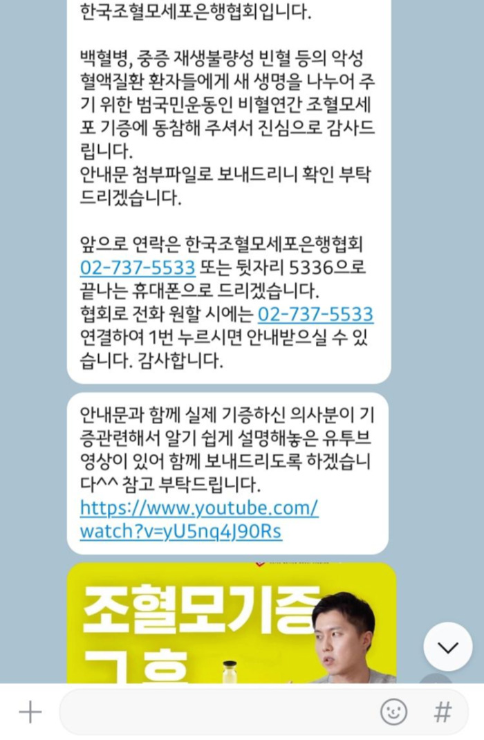 이후 통화로 한참 조혈모세포 기증에 대한 안내를 듣고 카톡으로 관련 자료를 받았다.