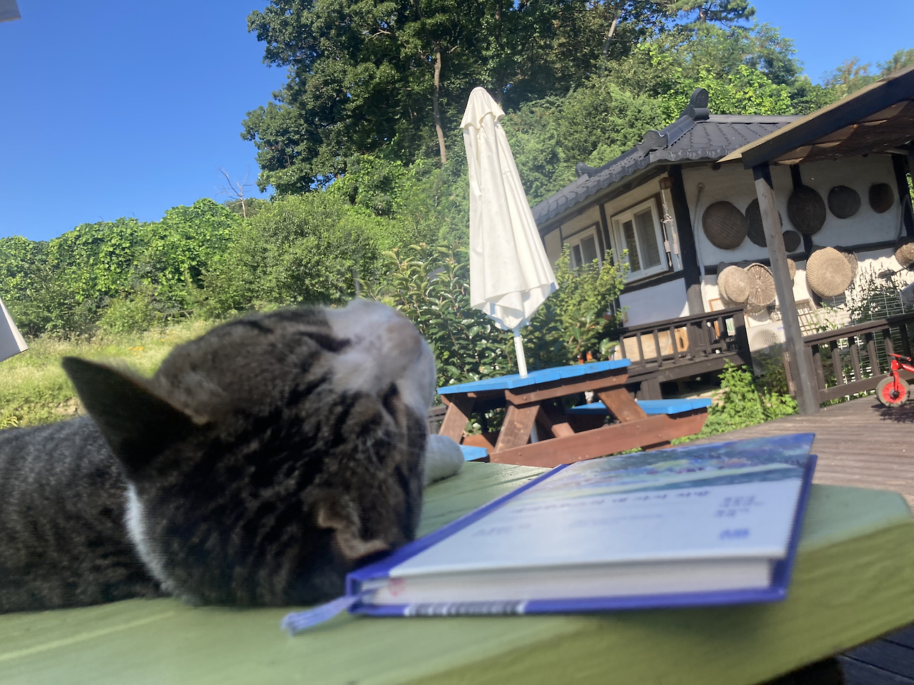 숙소에 있는 3일간 감탄하며 고개를 끄덕일 때가 많았다. 책을 골라둔 그의 안목, 오래된 할아버지 집을 잘 살려 꾸며낸 솜씨, 자연주의(?)로 자라게 두되 그 나름의 질서가 조화로운 정원, 고양이들을 대하는 다정함, 체리와 오렌지를 건네는 상냥함 그리고 마침 파업한 버스 때문에 고생할 우리를 위해 이천역까지 데려다준 친절. 이 멋진 사람과의 대화를 놓칠 수 없었던 나는 드디어 차 안에서 기회를 틈타 몇 마디 이야기를 나눌 수 있었다.
