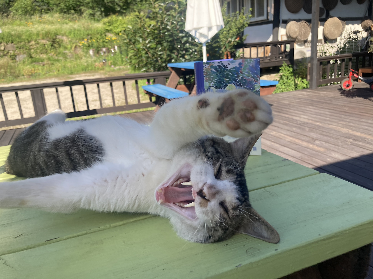 벌써 2박 3일이 다 지났다니. 말도 안 돼! 8시 반쯤 눈을 떠 숙소 앞 흔들의자에 앉아 책을 읽었다. 어느새 버번이 눈앞에 어슬렁 거리며 와서는 드러눕는다. 이거 지금 내 독서 방해하겠다는 귀여움 공격 맞지? 미안하지만 버번아, 나는 너보단 에피쿠로스가 더 좋다….. 고 말하면 좀 지독하려나. 나는 곧 이 고을 떠나고 책은 마저 읽어야 하거든.