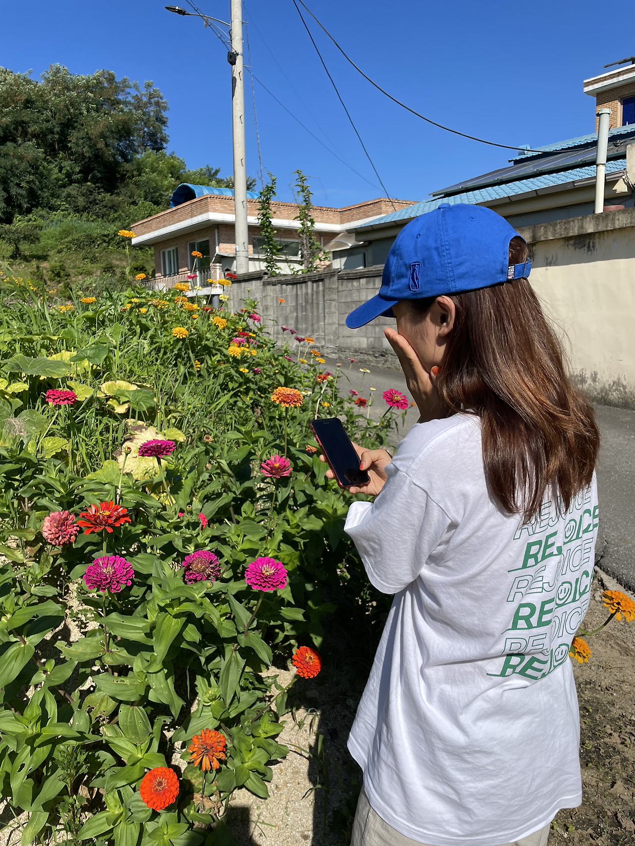 밖으로 나온 수빈이와 함께 동네 산책을 하기로 했다. 여행 내내 사진을 참 멋지게, 열심히 찍어주는 수빈 덕분에 오늘도 아침부터 파란 모자와 리죠이스 티셔츠가 반짝이는 사진들을 건졌다. 백일홍처럼 밝고 뚜렷한 색을 내는 너와 함께한 산책은 오래도록 기억에 남을 거야. 물론 이천 덕평리 골목길에 생겨난 우리 둘만의 비밀도!