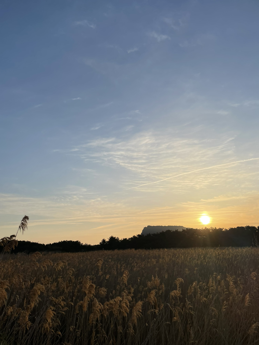 3월의 제주 아침, 성산일출봉과 일출이 보이는 오조리. 연고라고는 그 무엇도 없는 제주도이지만 희한하게 이곳에 와 크게 숨을 들이쉬면 고향에 온 것 같다. 살 것만 같다.