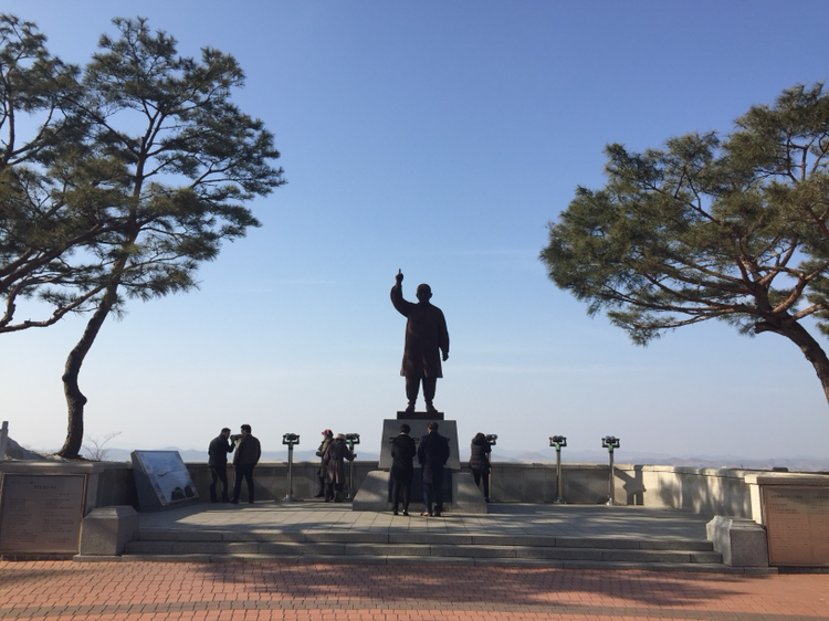 통일전망대 앞에 다른 누구가 아니라 그가 있는 것에 여러 이유가 있을 것이다. (내가 잘 알지 못하는 그의 뿌리와 행보 등에 따라 그가 선정된 복합적 이유가 있을터) 그럼에도, 우뚝 선 그가 가리키고 있는 손가락이 하늘을 향해있고 그 우직한 발이 두 땅을 밟고 있음이 건너편 파아란 하늘과 함께 마음에 담겼다.