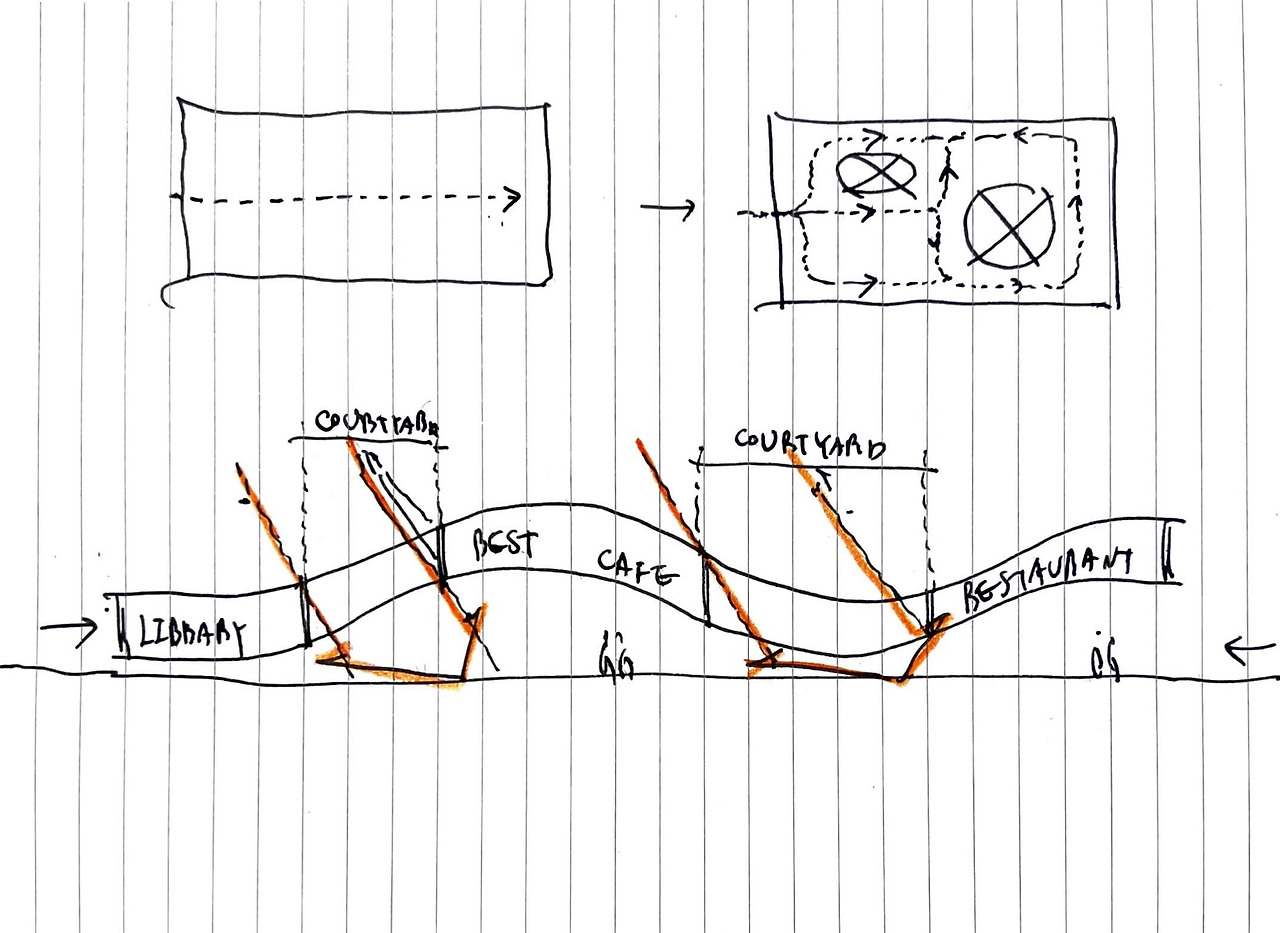 기능(가능성)을 통합하는 두꺼운 판, 그리고 그것의 역동적인 움직임, 그 이후에는 크고 작은 원형의 보이드가 판을 관통하여 다양한 크기의 중정을 만든다. 공간과 중정이 반복되며 공간은 다양한 크기로 분절되고 매스 안에서 여러 가지의 갈래길을 만든다. 자칫하면 공간의 통합이라는 개념이 만들어내는 단순하고 반복적인 공간이 일률적인 동선과 어두운 공간을 만들 수도 있었다. 하지만 매스에 새겨진 수평적인 다공성으로 인해 빛은 판 깊숙이 파고들고 길의 다양성은 늘어나며 공간-중정(외부)-공간으로의 복합적인 풍경이 펼쳐진다.