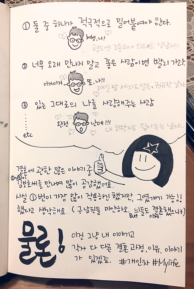 이런 성격을 아는지 믿고 장난 치는 거겠죠. 지난 번에 처음 그를 만났을 때 진심이 느껴졌다(2회차 참고)고 적으니 그 하나가 정말 크구나 하는 댓글을 보고는 제가 이 사람이랑 결혼한 이유도 여러가지가 있겠구나 생각했어요.