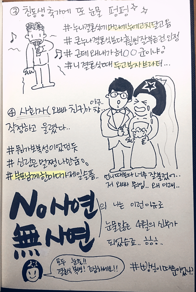 모두 저처럼 울어서 결혼식 앨범에 화장은 다 지워지고 얼굴 퉁퉁 부어 참 못 생기게 나오지 않기를!! ㅋㅋ