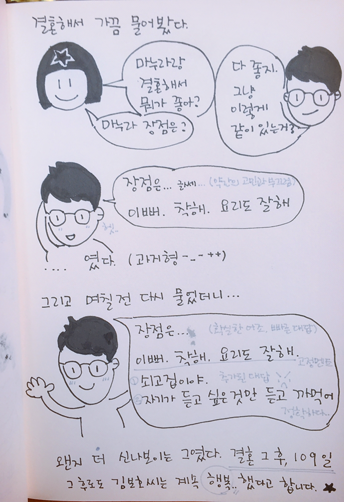 10년 넘게 혼자 오래 살아오다보니 결혼하고 나서 가장 좋았던 건 우리 집에 나 아닌 누가 함께 있다는 것과 든든한 내 편이 생겼다는 것이었죠.