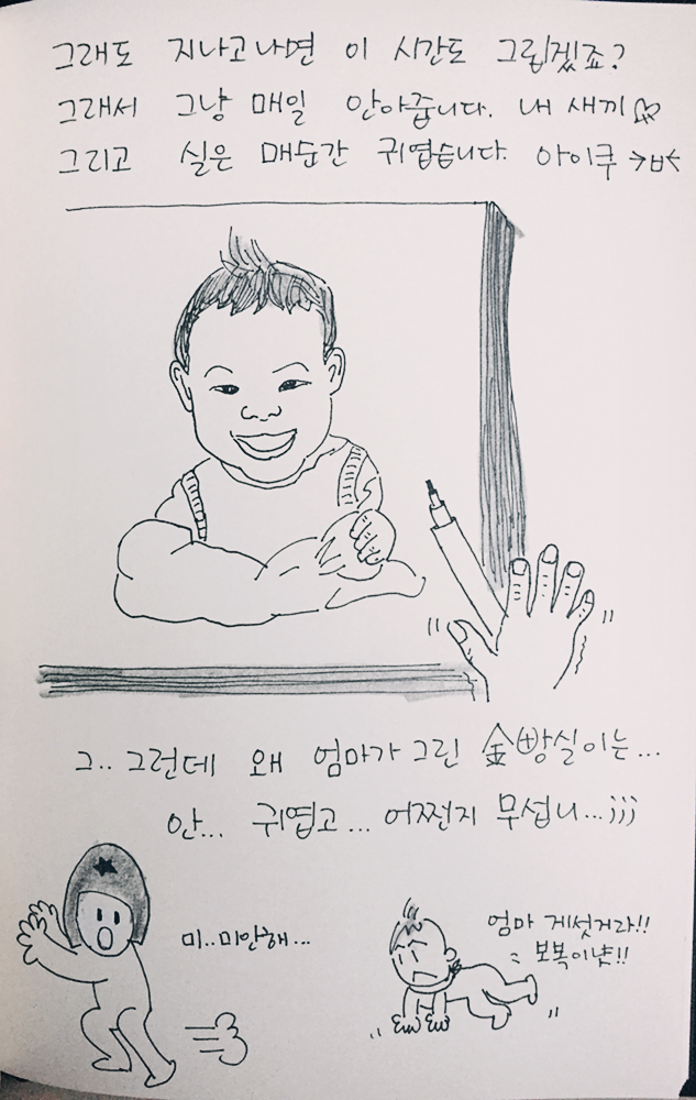 날 거짓말쟁이로 만드는 니가 미워서 이렇게 그린데 아니란다. 그림이 자꾸 줄어드는 엄마라 그래 ㅠ