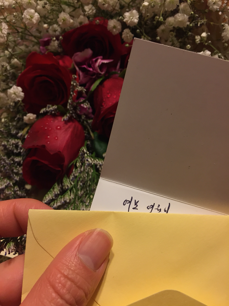 그 무뚝뚝한 사람이 카드도 써서 꽃도 골랐더라구요. 감동보다는 길거리를 걷는데 부끄러워서 참 곤란했다는게 웃겨서 깔깔대며 인증샷을 남겨뒀어요.
