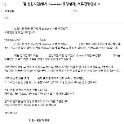 나는 오랜만에 메일을 열어 보았다. 먼저 경력직 사원에 지원했던 곳에서 한 통의 메일이 와 있었다.