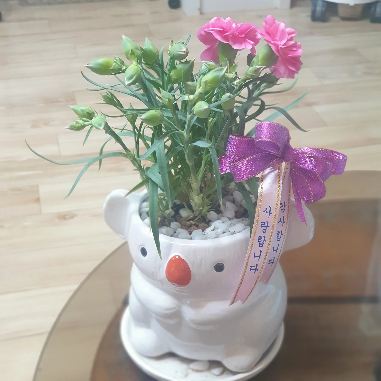 조금 있다 도착한 아들 손에 작은 카네이션 화분이 들려있었어요.