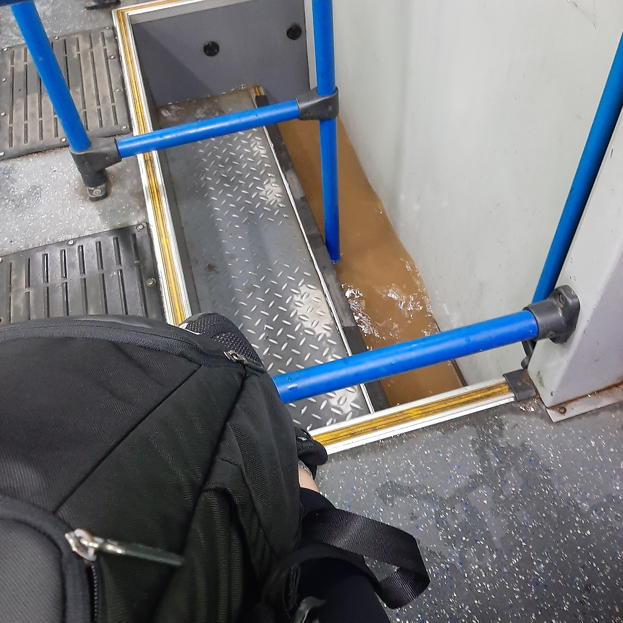 침수된 도로를 지나며 버스 안으로 물이 차오르고 있다.