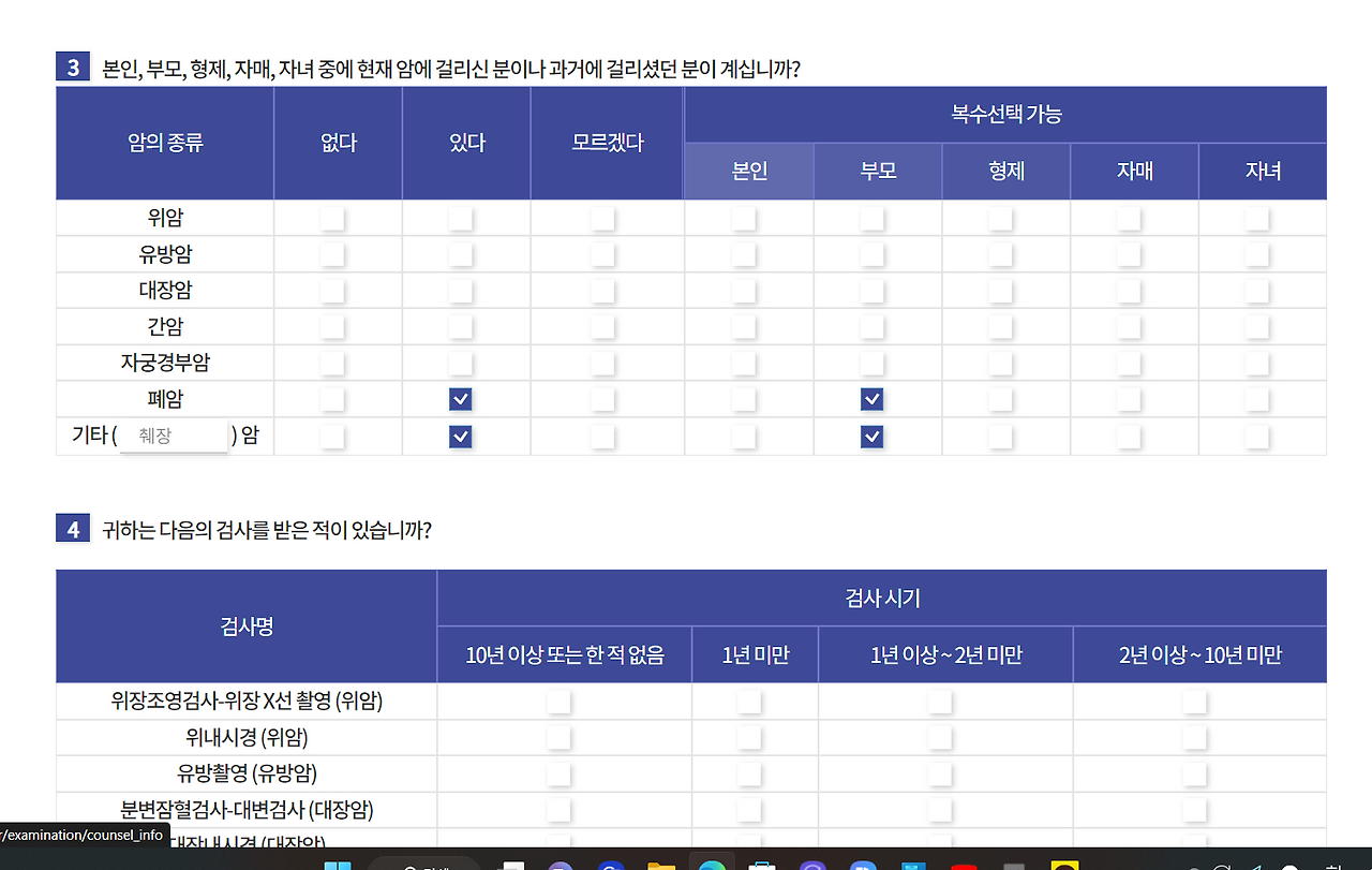 나는 폐암과, 췌장암에 있다. 체크를 하고, 부모에 체크를 했다.