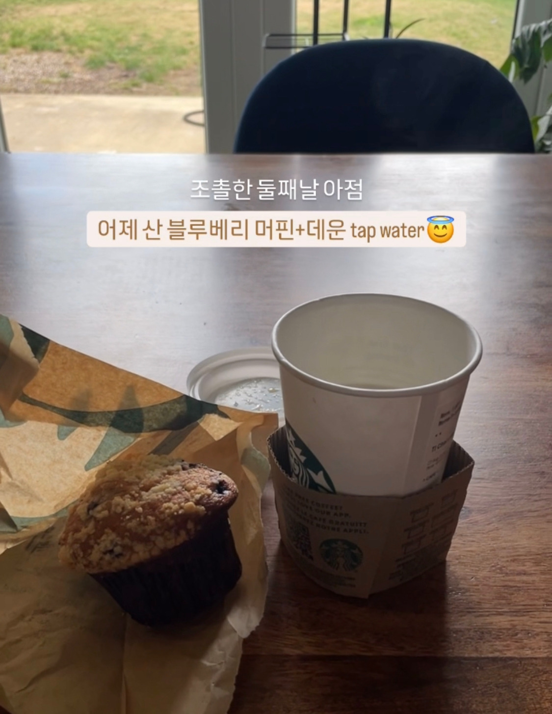 전 날 저녁, 스타벅스에서 데려온 블루베리 머핀으로 허기를 채웠다. 데운 tap water와 함께.