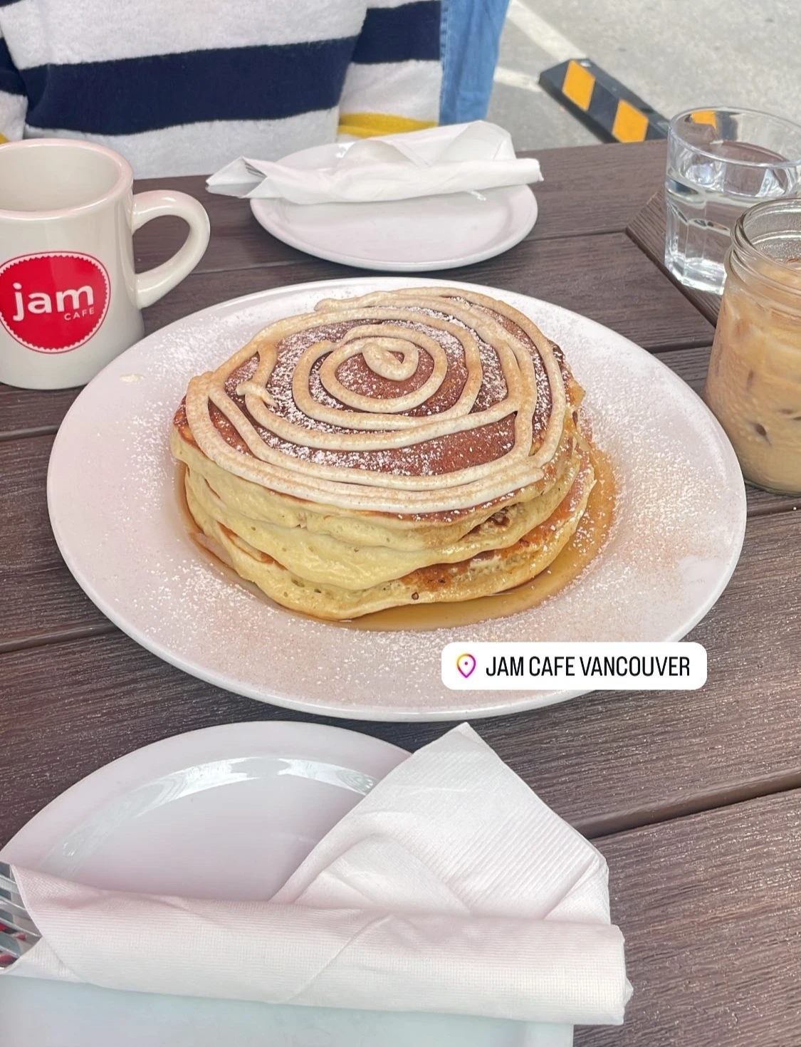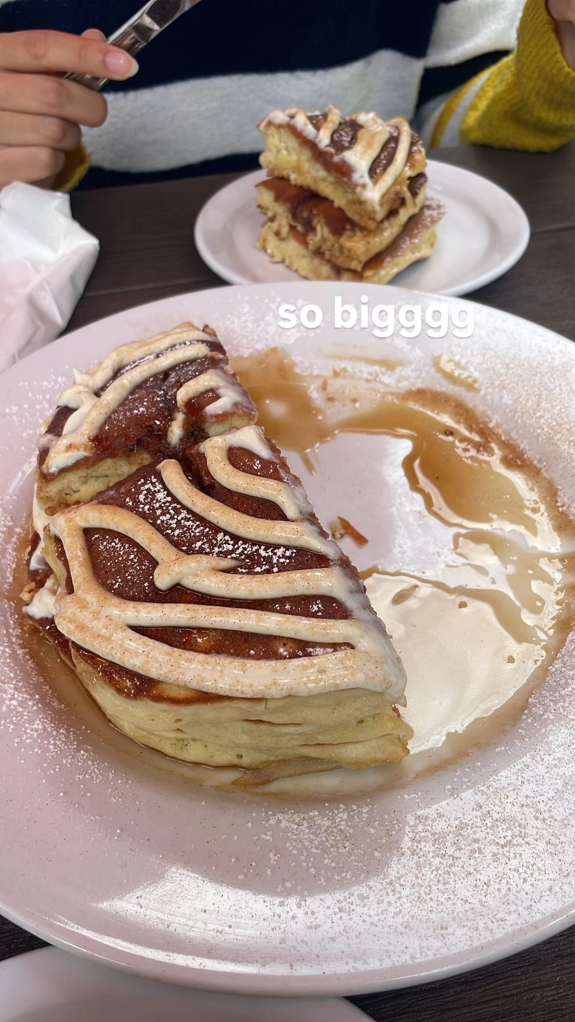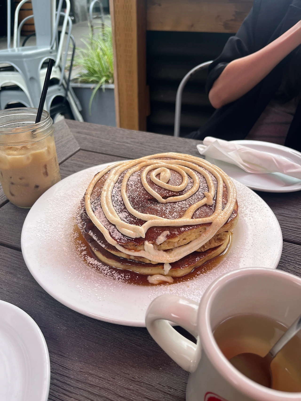 알고 보니 주말에는 오픈부터 줄을 설만큼 유명한 곳이었다. 우리도 살짝 대기하긴 했지만, 금방 안내를 받아 야외 자리에서 먹었다. 시나몬 팬케이크를 시켰는데 진짜 양이 어마어마하다.