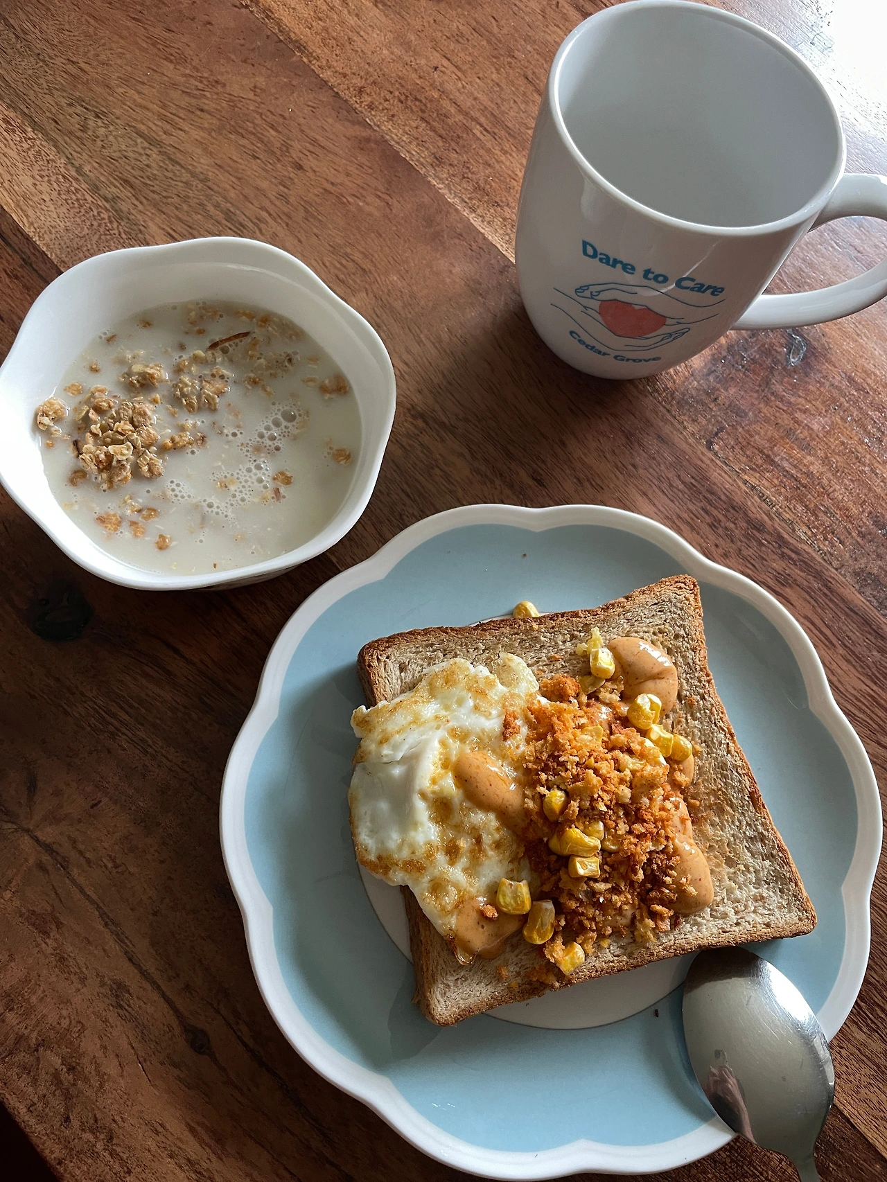 토스트 위 뿌린 드레싱과 시즈닝 가루는 야채 믹스에 들어있던 것 재활용.