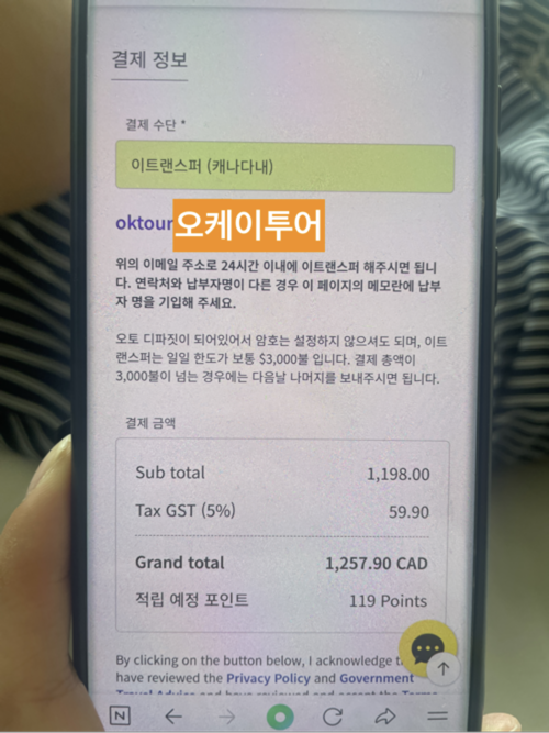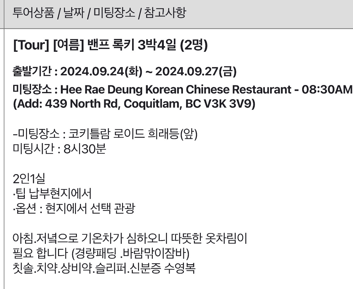 밴쿠버 내에는 대표적으로 로얄투어, 오케이투어 두 개의 여행사가 가장 큰데 우리는 오케이투어를 이용했다. 성인 2명, 3박 4일 일정으로 저 정도 금액. 물론 식비나 가이드, 운전기사 팁은 별도이다.