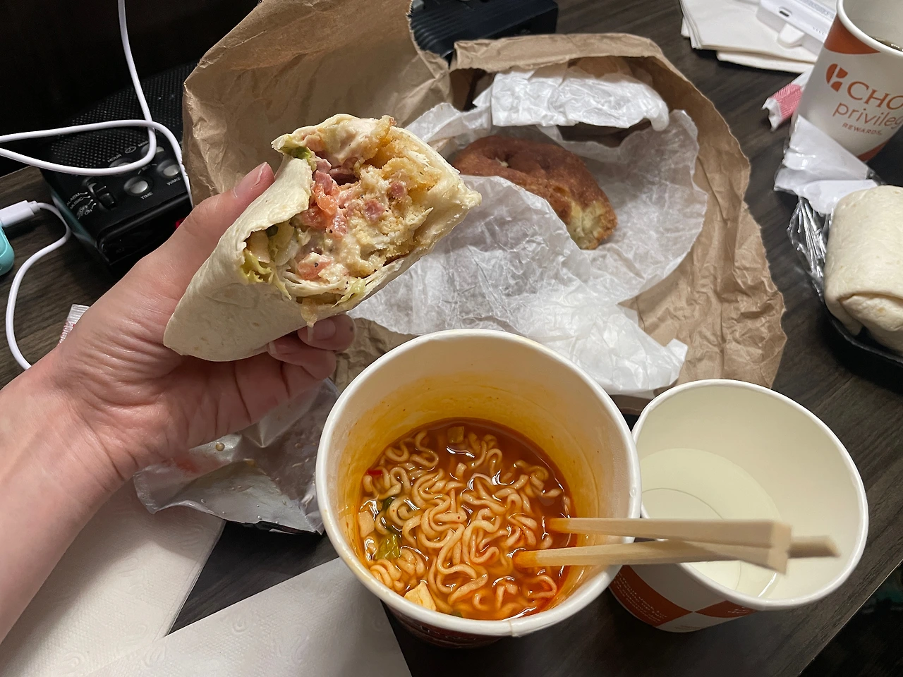 저녁은 오는 길 마켓에서 산 샌드위치와 언니가 야무지게 챙겨 온 컵라면! 만족스러운 조합이었다.