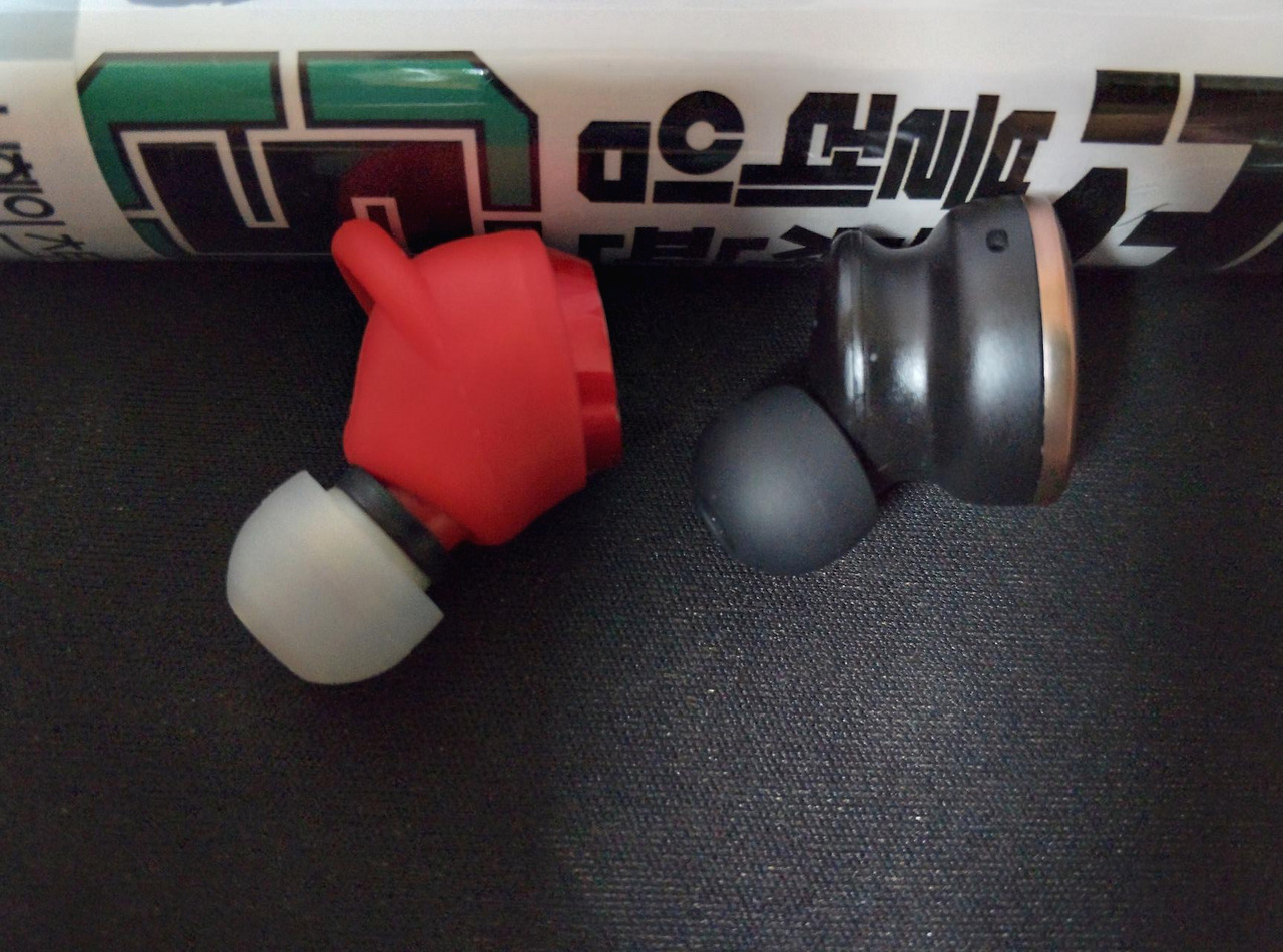 사진에서 보이는 것처럼 이 제품은 노즐이 타원형입니다. 이렇게 만들면 어떤 장점이 있는지 모르겠지만 여하튼 이 독특한 노즐 모양 덕분에 사용할 수 있는 이어 팁에도 제한이 있습니다. 제품 구입 시 제공되는 기본 이어 팁 세 쌍 모두 살펴보니 이 노즐에 가장 적합한 모양으로 만들어졌더군요. 가지고 있는 이어 팁이 대략 여섯 종류가 있어서 다 장착해봤는데 아즈라 세즈나 이어 팁이 그나마 사용 가능했고, 스핀핏이나 만다린 심비오팁, 컴플라이 폼팁은 장착은 가능해도 제대로 된 음악 감상은 불가능했습니다.