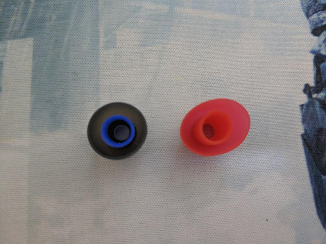 사진에서 왼쪽에 있는 이어팁이 일반적인 이어폰에 사용 가능한 제품이고 오른쪽이 AIR-X 용 이어팁입니다. 둘 다 라지 사이즈임에도 확연히 AIR-X 쪽이 크고 노즐과 결합되는 부분의 내경도 큰 차이가 나는 것을 볼 수 있습니다. 물론 왼쪽에 있는 이어팁도 우격다짐으로 끼워 넣을 수는 있지만 크기 차이 때문에 사용하다 보면 점점 이어팁이 빠져나오는 모습을 볼 수 있습니다.