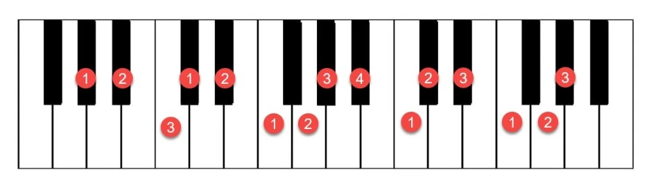 손가락은 다섯 개 뿐이고, 피아노에는 흰 건반 사이 상단에 검은 건반이 있기 때문에 무조건 1번부터 순서대로 건반을 누를 순 없다. 더 이상 누를 손가락이 없게 되면 손가락을 돌려야 하기 때문이다. 그래서 그때 그때 상황에 따라 손가락 번호가 바뀐다. 하지만 어느 정도 일정한 법칙은 있다. 그래서 손가락 번호에 맞게 스케일 연습을 해야 한다.