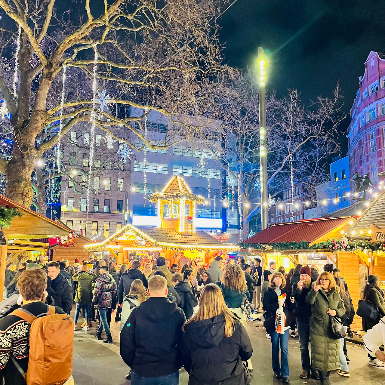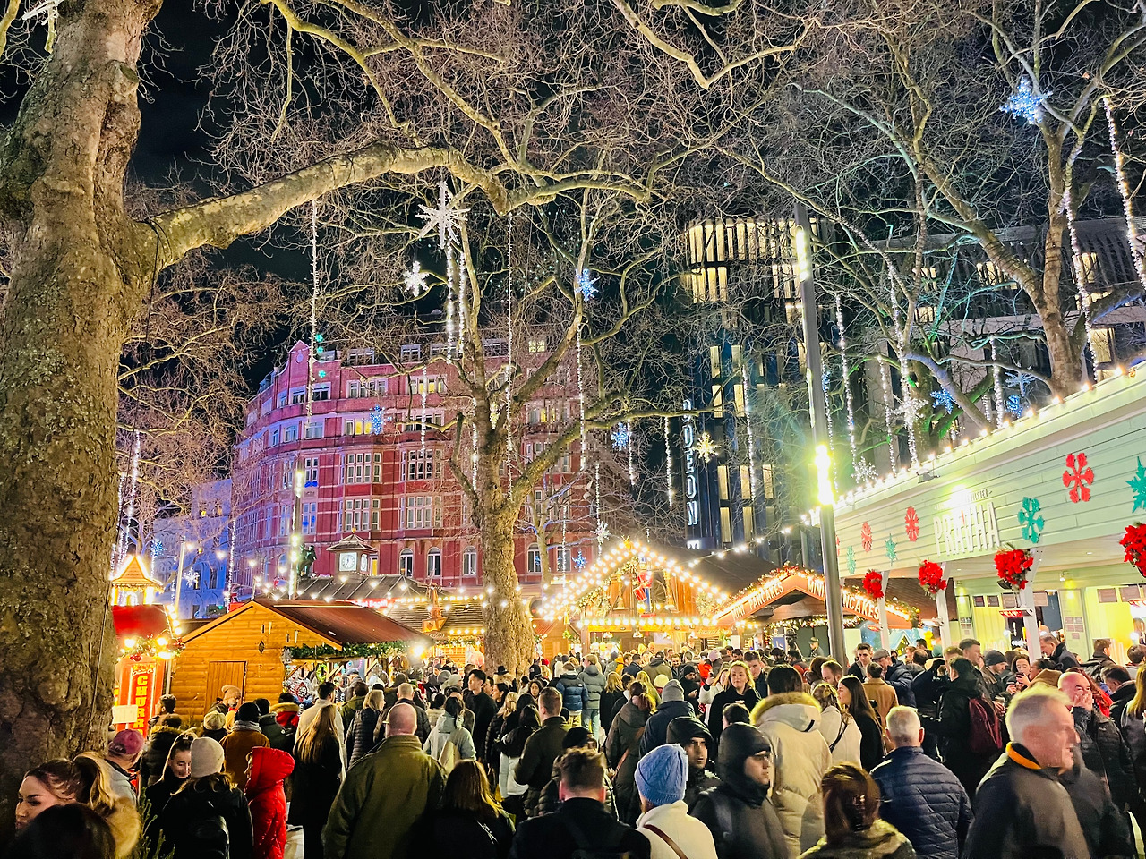 레스터 스퀘어는 런던 중심부에서 가장 활기찬 겨울의 축제 현장 중 하나이다. 빨간색과 금빛으로 장식된 크리스마스 마켓의 부스들은 따뜻한 와플과 향긋한 글뤼바인(Glühwein) 냄새로 방문객을 유혹한다. 사랑스럽게 반짝이는 트리 아래에서는 어린아이들의 웃음소리가 울려 퍼지고, 거리의 악사가 연주하는 캐럴은 주변을 한층 더 로맨틱하게 만든다. 레스터 스퀘어는 크리스마스 시즌 외에도 버스킹 공연이 많은 곳이기에, 다양한 스트릿 뮤지션을 만나볼 수 있다.