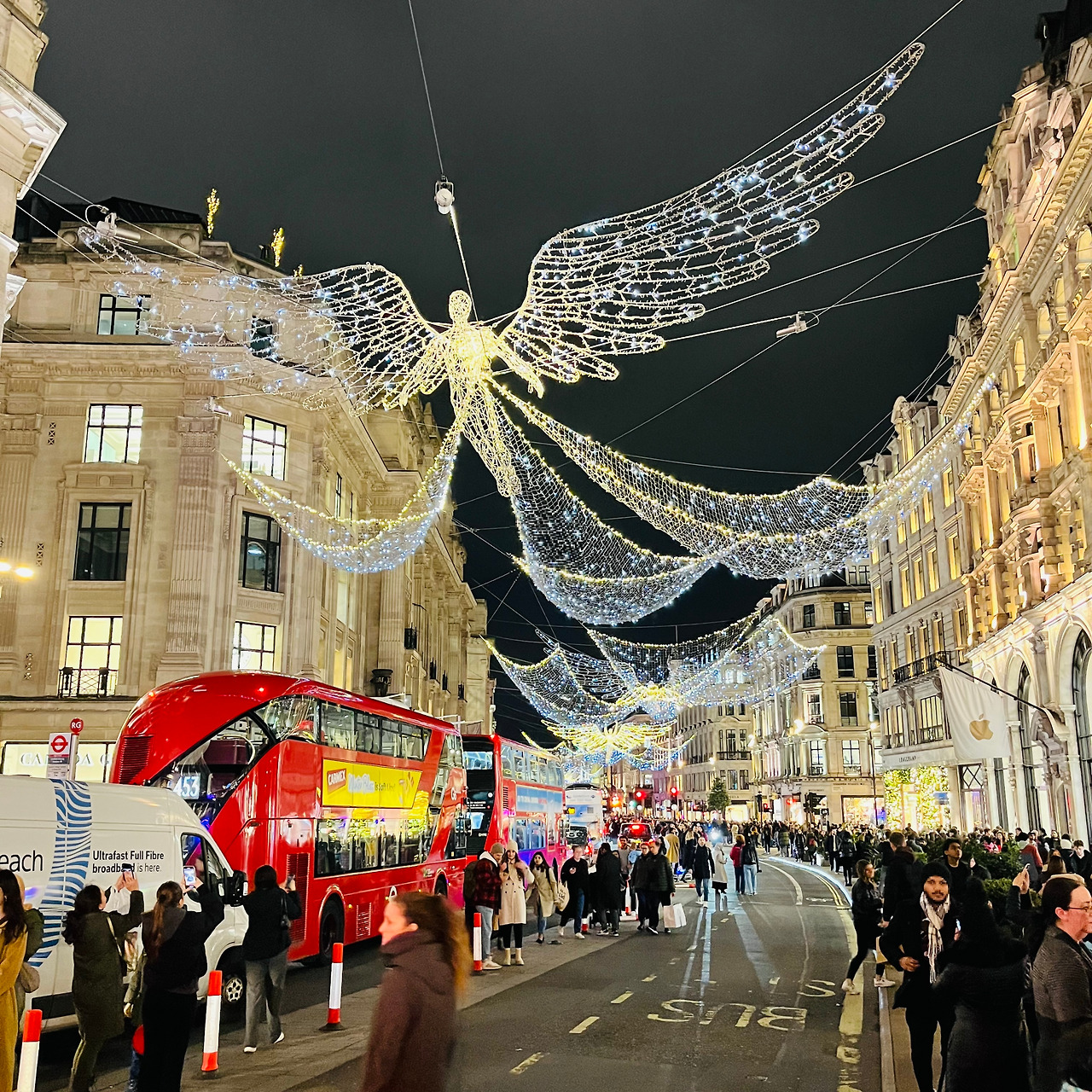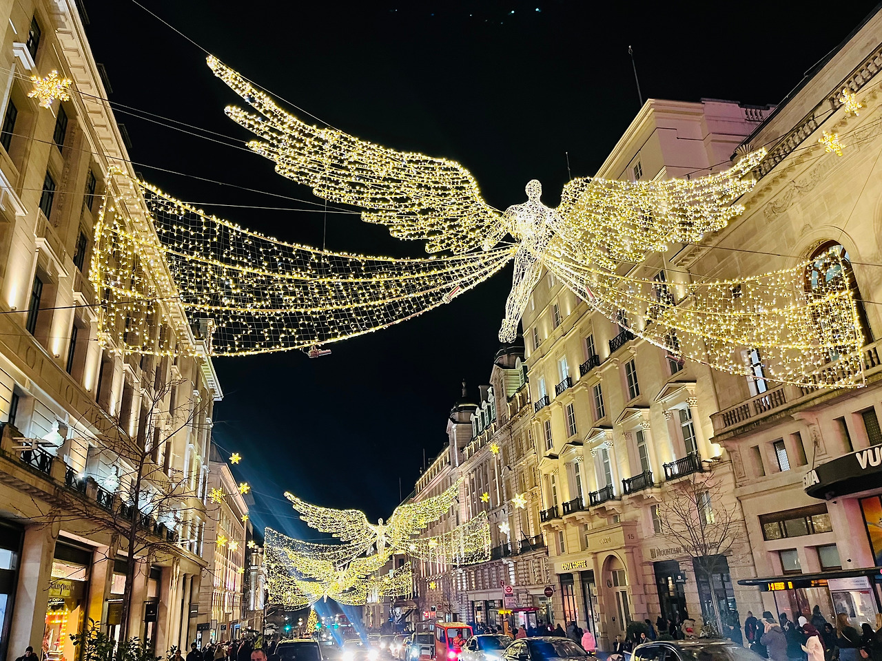리젠트 스트리트는 그야말로 런던 크리스마스 일루미네이션의 중심지라 할 수 있다. 황금빛 천사가 하늘을 나는 듯한 디자인의 조명은 모든 이들의 시선을 사로잡는다. 이 거리에서 쇼핑을 즐기다 보면, 쇼윈도마다 화려하게 꾸며진 크리스마스 디스플레이가 끝없는 동화 속 장면처럼 펼쳐진다. 길거리 중간에 설치된 보도블록은 최고의 포토스팟으로 손꼽힌다.