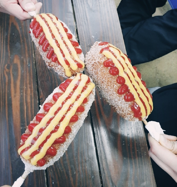 가방을 진 그를 따라 스무 걸음쯤 갔을까. 모종의 기대로 일제히 멈춘 곳은 목요일에 오는 핫도그 장수 앞이다. 한 입 베어 물때 퍼지는 비릿한 분홍 소시지는 씹자마자 목구멍으로 넘어가는 요물이다. 고기라고는 명절과 가장의 생일 때에야 맛보던 우리에게 핫도그는 참기 힘든 유혹이다. 빵빵하게 부푼 튀김옷을 혀로 살살 돌리다가 바삭한 겉을 벗기면 단내 나는 뽀얀 밀가루 속이 나온다. 조심히 뜯어 먹으면 마침내 막대기에 분홍 소시지만 남는다. 꼬챙이에 꽂힌 보물을 하늘로 치켜들며 신난 우리는 집에 도착할 때까지 최대한 조금씩 아껴 먹었다.