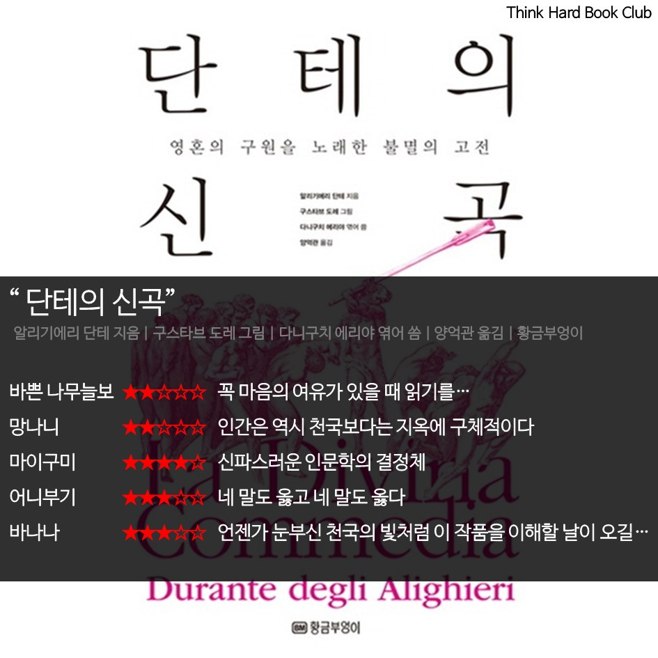 혼자라면 시도하지 않았을 책을 완독 한 것, '신곡' 책 내용에만 머물지 않고 다방면으로 이야기를 나누며 책에 대한 흥미와 이해도를 높인 것(각자가 생각하는 사후 세계, 연옥의 신체적 고통에 대한 의미, 후회에 대한 개인적 경험 및 대처 방안까지)이 좋았던 모임이었다. 그리고 이번 모임부터 책의 한 줄 평을 적기로 했다. 멤버들이 어떻게 책을 읽었는지 압축적으로 알 수 있어 즐거웠다. 혹여 브런치를 찾아온 독자들에게도 책을 택하는 데에도 도움이 되길 바라며 단테의 신곡 모임을 마친다.