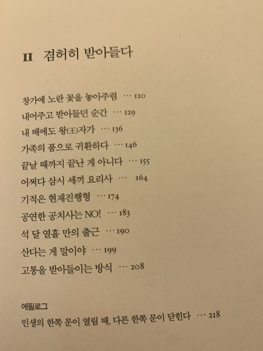 고통과 간병에 대한 책이면서 동시에 그 마저도 삶으로 받아들이는 작가의 자세를 엿볼 수 있는 책이다. 이제 와서 고통은 선물이라는 말이 조금, 아주 조금은 와 닿기도 한다. 왜냐하면 산다는 건 조용히 우는 것이기 때문이다.**