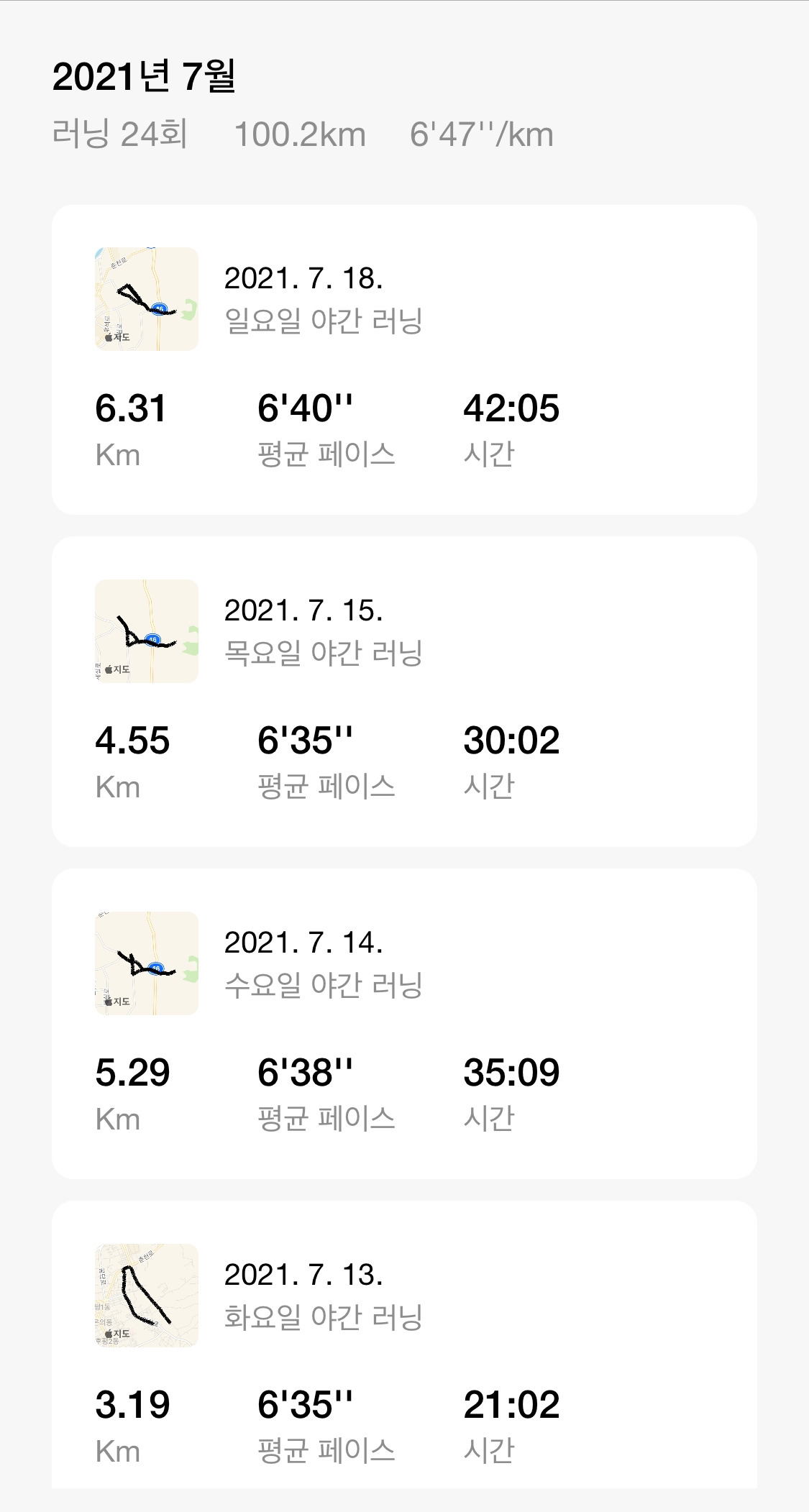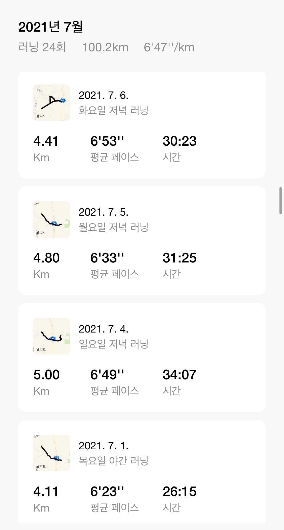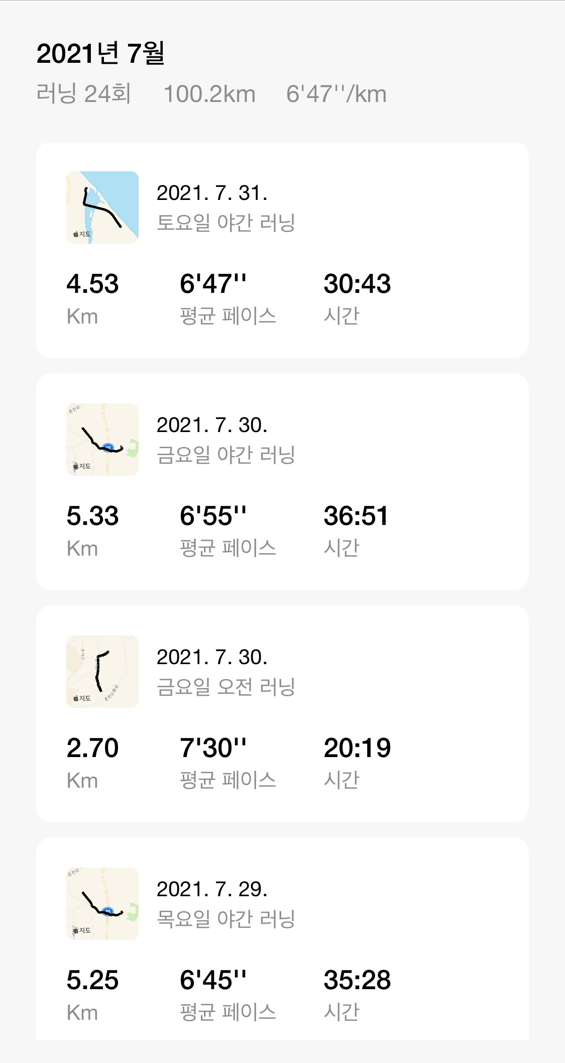 월말에 가까이 되어서는 아침, 저녁 이렇게 2번을 뛰기도 했다. 꾸준히 뛰지 못하고 월말에 몰아서 뛴 것이 아쉬웠다. 그러나 목표가 없었으면 이는 달성할 수 없었을 것이다. 덕분에 달리는 거리가 5~7km까지 늘어났다. 그냥 달렸으면 거리를 늘리지 못했을 것 같다. 그러나 임계점을 넘는 경험을 통해 이제는 6~7km 정도의 러닝에 대한 두려움이 많이 줄어들었다.