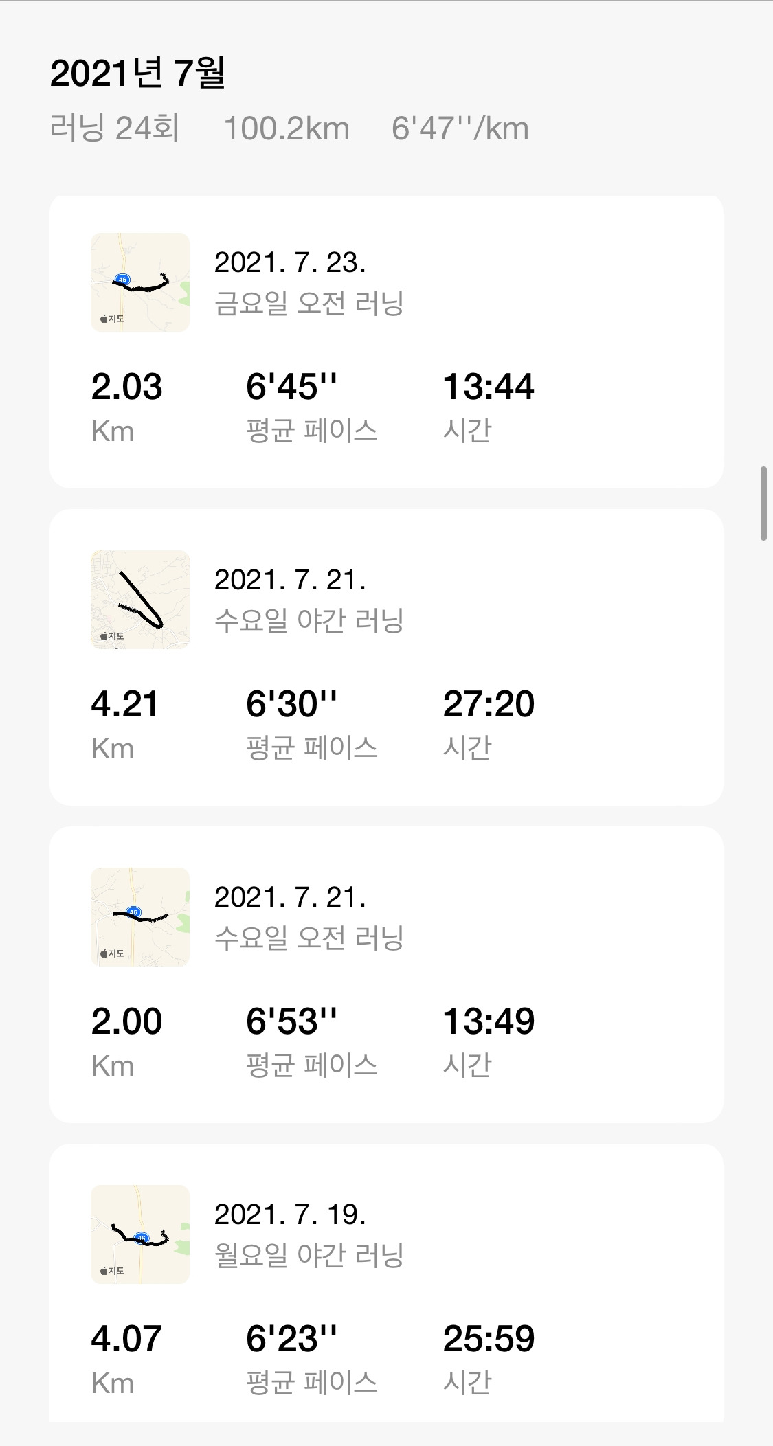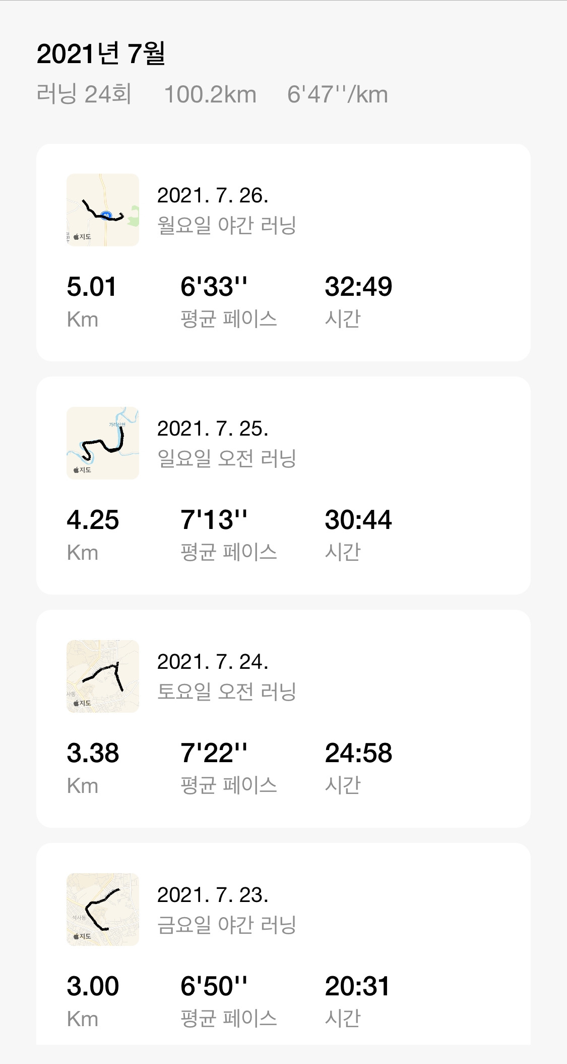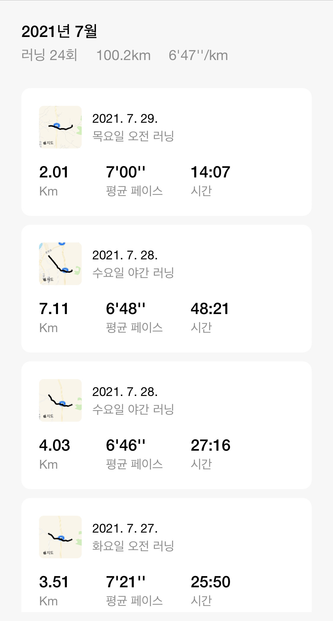 월말에 가까이 되어서는 아침, 저녁 이렇게 2번을 뛰기도 했다. 꾸준히 뛰지 못하고 월말에 몰아서 뛴 것이 아쉬웠다. 그러나 목표가 없었으면 이는 달성할 수 없었을 것이다. 덕분에 달리는 거리가 5~7km까지 늘어났다. 그냥 달렸으면 거리를 늘리지 못했을 것 같다. 그러나 임계점을 넘는 경험을 통해 이제는 6~7km 정도의 러닝에 대한 두려움이 많이 줄어들었다.