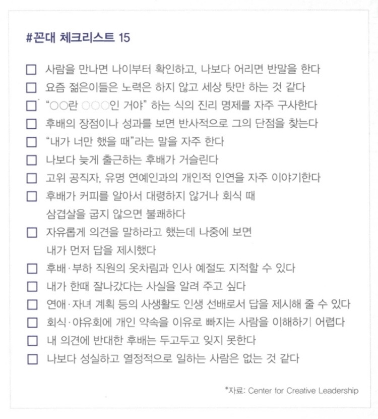 꼰대 테스트를 찾아보았다. <꼰대 김철수>라는 책에서 꼰대 체크리스트 15를 제시하고 있었는데, 나를 뜨끔하게 하는 문항들이 꽤 있었다. 이대로 가다간 정말 꼰대가 될 것 같았다.