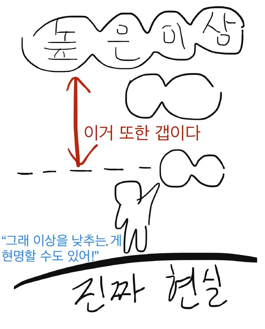 사실 삶의 문제는 훨씬 복잡하다. 위의 단순화한 사례와 조언을 모든 이에게 일반화하기 어려울 수도 있다. 요컨대, 현실과 이상의 차이를 줄이는 것이 핵심이다. 현실을 높일지, 이상을 낮출지는 당신의 선택이다.