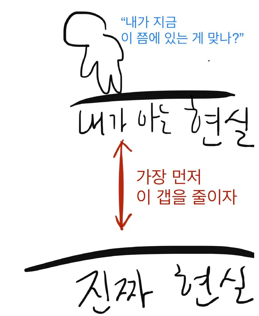 현실을 올바르게 보아야 한다. 지금 나의 위치를 아는 것이 우선이다. 현재의 나를 알지 못하면 이상과의 차이 정도를 가늠할 수 없기 때문이다. 당신은 누구이며, 당신의 현재 위치는 어디쯤인가? 당신이란 '존재'와 사회적 '역할'에 대한 정의가 잘못되면, 현실이 괴로울 것이다. 매일 가수 데뷔만 생각하는 A는 본업을 등한시할 확률이 높다.