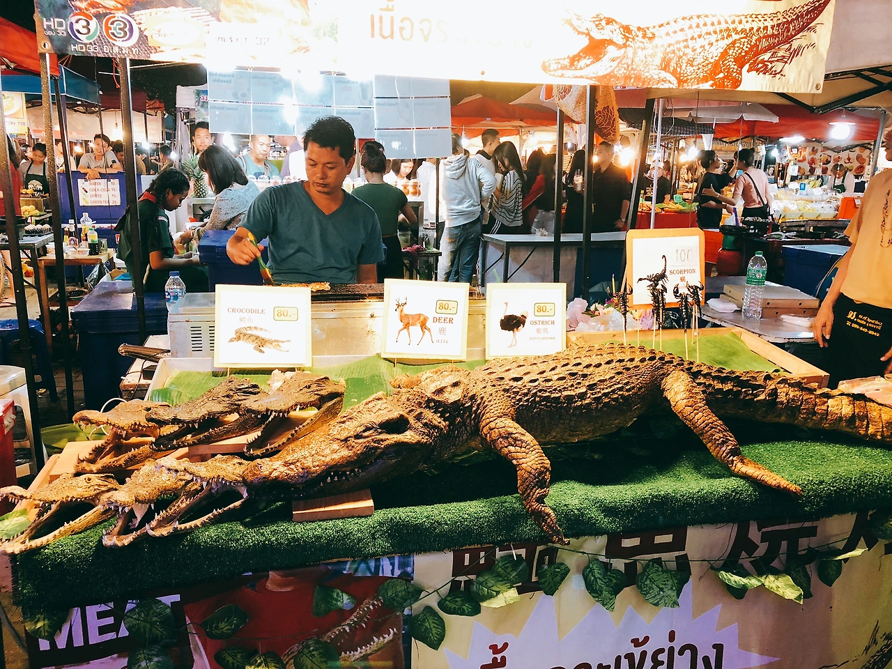 주변 먹거리들 중에는 악어 고기를 파는 곳도 있었다. 꼬치 형태로 팔았는데 왠지 호기심이 나서 도전해 볼까 하다가 참았다. 저 앞에 악어가 너무 멋지고 무섭게 엎드려 있어서 쫄았을까? 사실 무슨 맛일까 아직도 궁금하긴 하다.