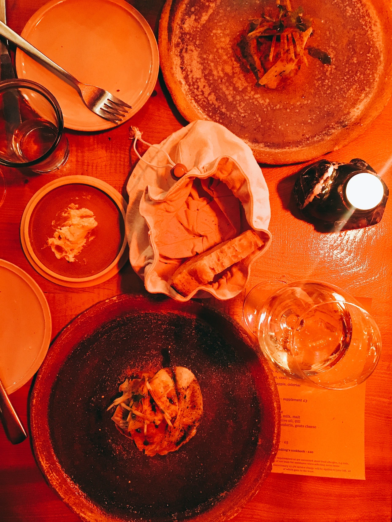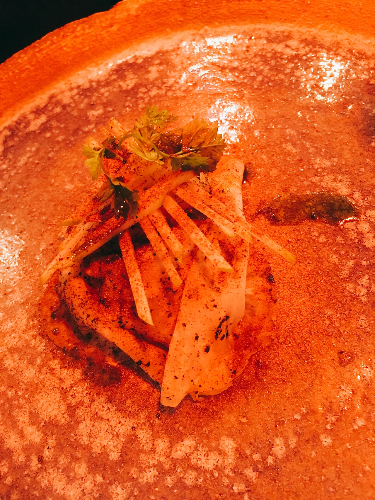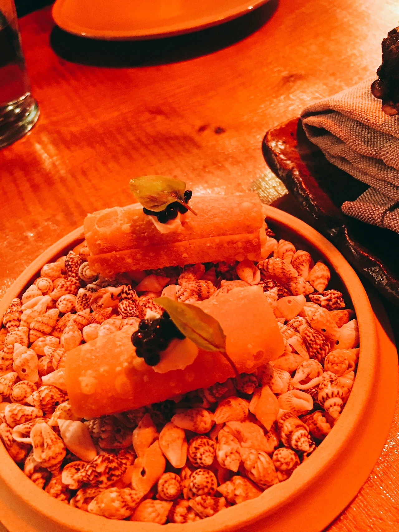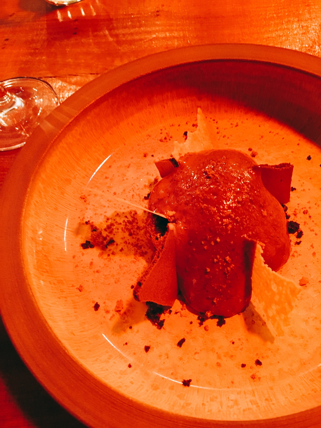 아래는 진짜 감질나게 한 개 두 개씩 나오는 요리들의 사진이다. 붉은빛의 조명 때문에 사진이 다 붉다. 요리마다 특색이 있고 맛도 다양한 맛을 내었다. 솔직히 어떤 맛인지 알 수 없었다. 그냥 특이하구나 라는 생각이 지배적이었다. 물론 디저트 류로 넘어갔을 때에는 달달함과 특이한 맛이 매우 좋긴 했다.