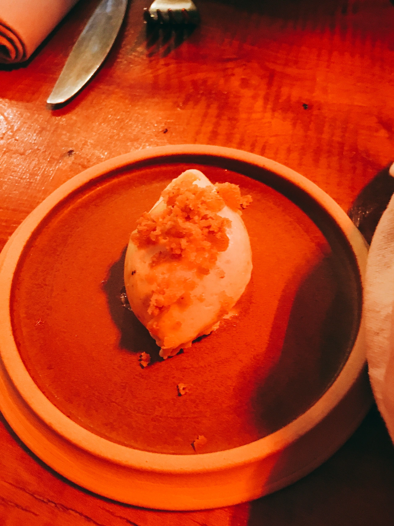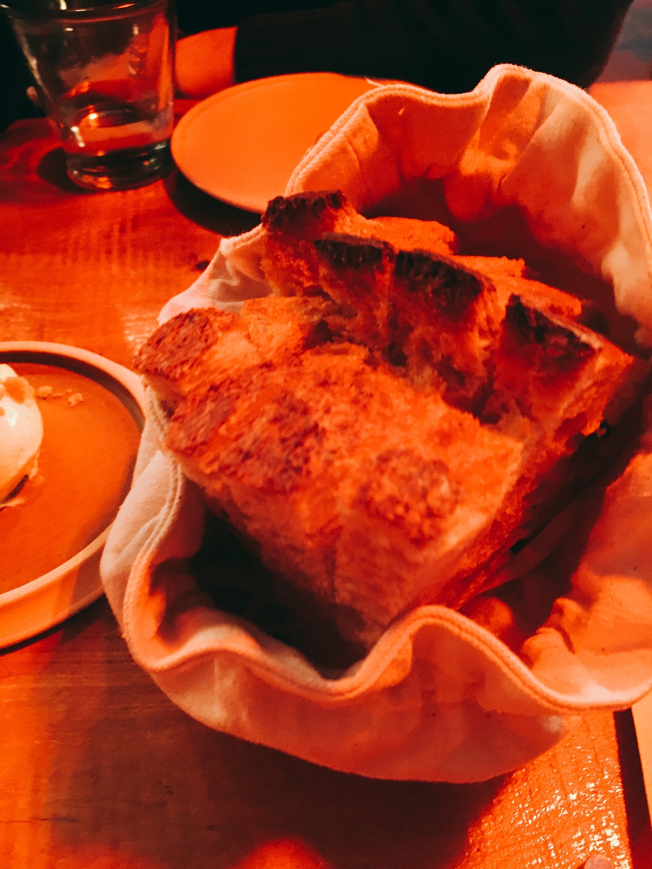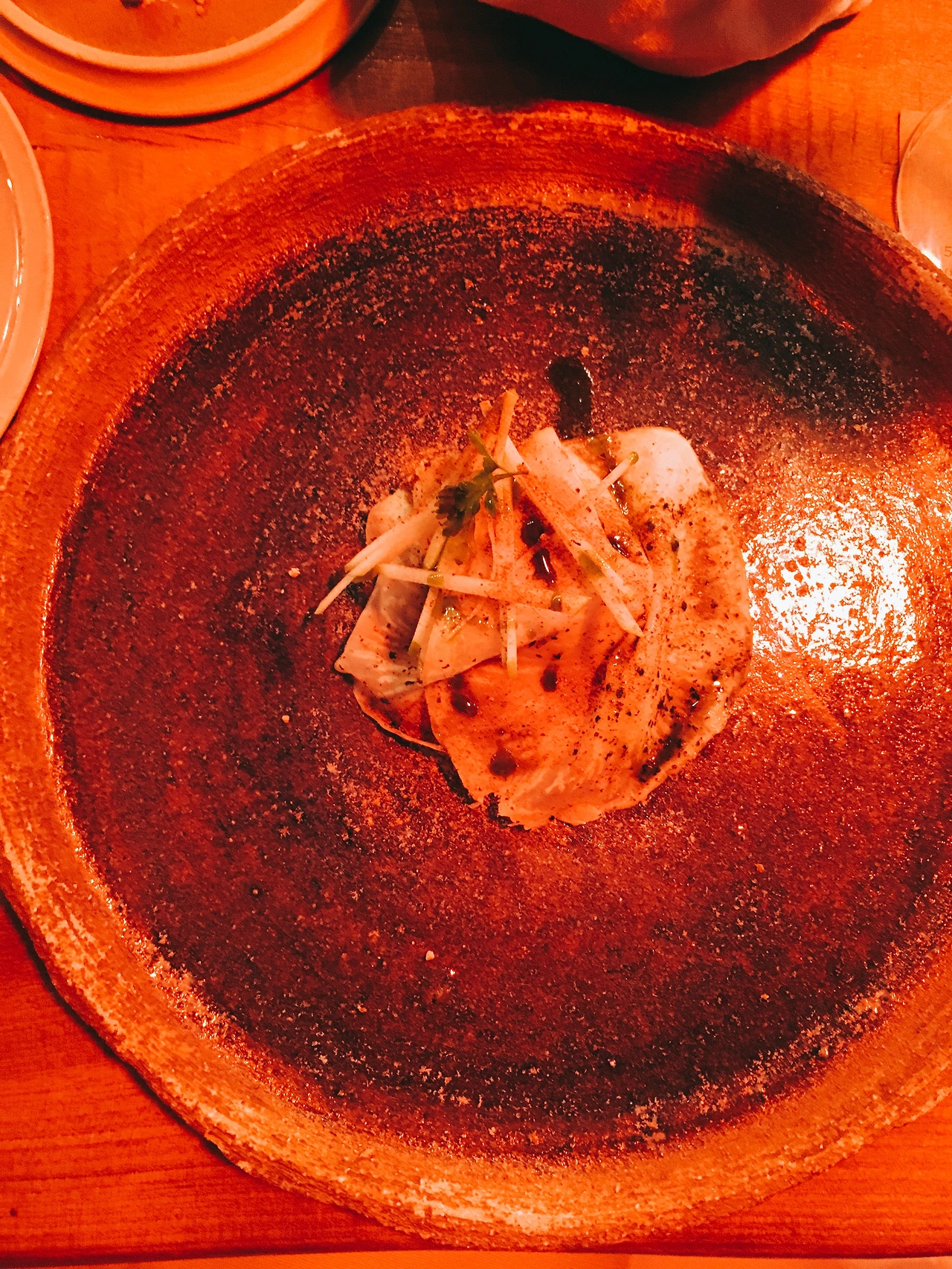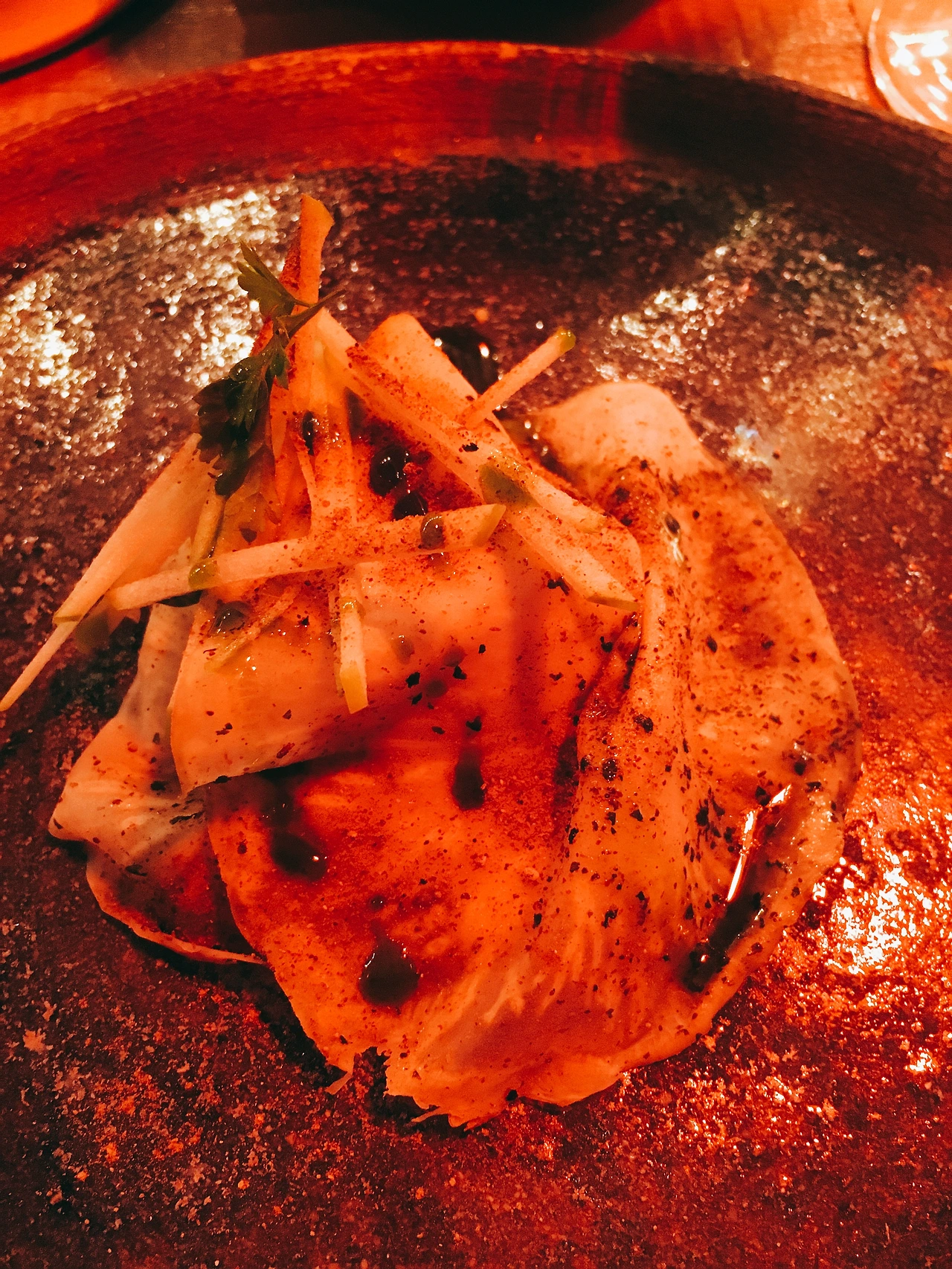 아래는 진짜 감질나게 한 개 두 개씩 나오는 요리들의 사진이다. 붉은빛의 조명 때문에 사진이 다 붉다. 요리마다 특색이 있고 맛도 다양한 맛을 내었다. 솔직히 어떤 맛인지 알 수 없었다. 그냥 특이하구나 라는 생각이 지배적이었다. 물론 디저트 류로 넘어갔을 때에는 달달함과 특이한 맛이 매우 좋긴 했다.