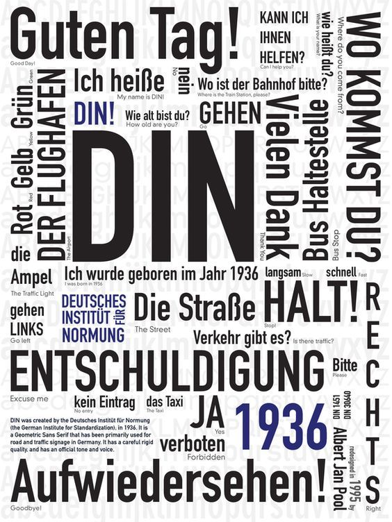 독일 공업 규격 위원회(Deutsches Institut für Normung e.V.)의 표준 규격화의 일환으로 시작된 독일의 규격 폰트로 시작되었다. 독일에서의 시인성이 좋고 간결하게 때문에 모든 공공 규격을 이 폰트로 사용하고 있다. 헬베티카와 버금갈 정도로 시리즈도 다양하고 잘 구성되어 있는 폰트이며, 그 쓰임새도 다양하다.