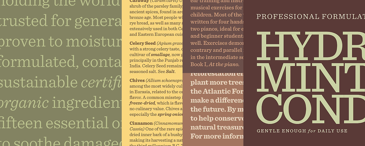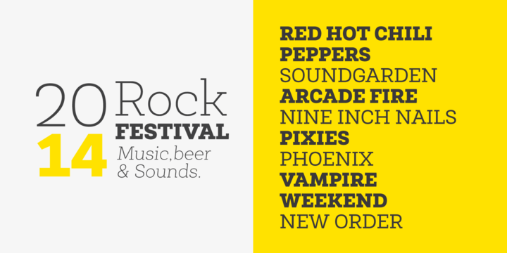 인기 있는 슬랩 세리프이다. 타이틀이나 본문으로도 예쁘게 쓸 수 있다. 현대적인 감각의 슬랩 세리프는 올드해 보이지 않는 장점과 함께 미적으로도 성공적 결과물을 얻을 수 있다.