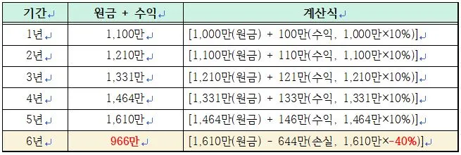 표. 1,000만 원 투자 시 수익률 현황(5년간 10% 수익과 6년 차 40% 손실 시)