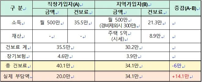 위의 표에서처럼 월 급여로 500만 원(세전)을 받는 직장가입자와 동일한 금액을 버는 지역가입자를 비교할 때 총건보료는 40.1만 원과 34.1만 원으로 직장가입자가 6만 원 정도 더 많이 부과되지만, 지역가입자의 경우 총액을 모두 부담해야 하므로 실제 건보료는 직장가입자에 비해 14.1만 원을 더 많이 내야만 한다.(만약 국민연금과 같은 추가 소득이 있다면 당연히 납부할 건보료는 더 증가한다)