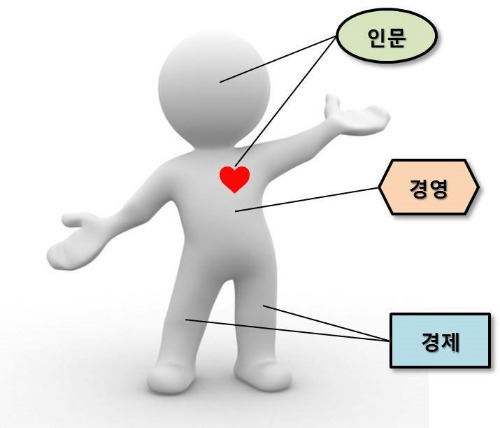 그림 1은 인간의 몸을 셋으로 구분하여 각각 인문, 경영 그리고 경제와 매칭시킨 휴매노믹스의 개요도라 할 수 있다. 다리는 인체의 가장 기초가 되는 부분으로써 경제에 해당한다. 직립(直立) 뿐 아니라 이동을 위해서라도 핵심적인 요소이기 때문이다. 경제가 흔들리면 삶도 따라 요동칠 수밖에 없기에, 튼튼한 두 다리는 우리 삶에 있어 중요한 기초가 된다 하겠다.