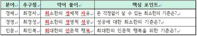 여기서 제일 중요한 것은 최경자와 최경성의 조건은 ‘최소한’이지만, 최인복의 경우는 ‘최대한’이라는 거다. 경제와 경영은 내가 정한 최소한의 기준점을 향해 걸으면 된다. 즉 경제적으로는 돈 걱정 없는 인생(=경제적 자유)을 위한 최소한의 기준을, 경영적으로는 일을 통해 이룰 수 있는 최소한의 성공을 향해 묵묵히 가면 된다. 다만 인문적 관점은 다르다. 최소한이 아닌, 최대한을 목표로 해야 한다. 즉 내가 얻을 수 있는 최대한의 행복을 기준으로 삼아야 한다는 것이다. 그래야만 삶이 더 풍요롭고 행복해질 수 있기 때문이다.