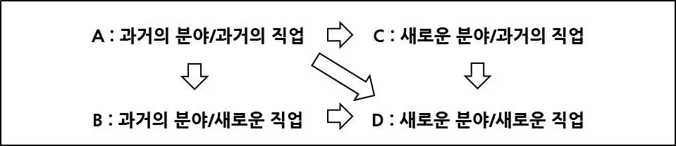 마지막 세 번째로는 A → D처럼 분야와 직업 모두 바꾸는 것입니다. 즉 현재 방송국에서 회계사란 일을 하고 있었다면, 향후로는 의료분야의 기자로 변신하는 것이죠. 이 방법은 세가지 중에 가장 파격적이라 할 수 있지만, 또한 가장 실현시키기 어려운 방법이라 할 수 있습니다. 생각해보시죠. 분야만 바꿔도 적응이 힘든데, 거기에 더해 직업까지 바꾸기 위해서는 위의 두가지 방법보다 더 많은 준비와 시간, 그리고 노력을 필요로 할 수 밖에 없습니다. 그리고 그런 노력을 기울였다 할지라도 성공 가능성이 높지 않다는 것은 부인하기 어렵다 하겠습니다. 하지만 이 방법은 현재가 아닌, 50대 이후의 인생2막까지 고려한다면, 그리고 평생직업이란 관점에서 생각한다면 반드시 깊이 생각해야 할 방법 중에 하나입니다. 왜냐하면 평범한 직장인의 경우 현재는 직업보다 직장이 우위에 있을 수 밖에 없지만, 미래로 가면 갈수록 직업이 자신의 위치와 가치를 결정해 줄 것이기 때문입니다.