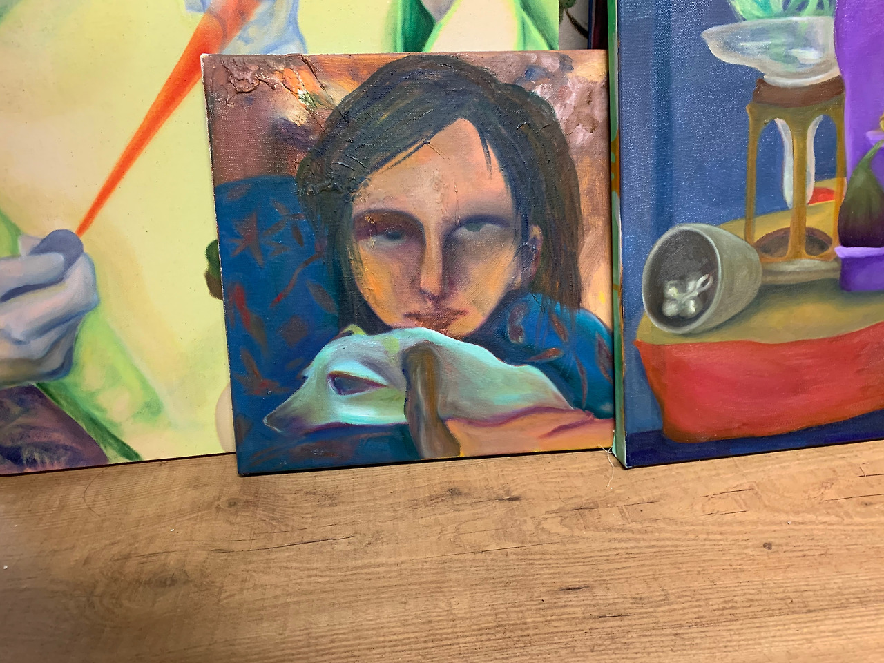엄지 손가락으로 강아지를 꼭 안고 있지만 강아지는 편안하다. 빛을 받아 주인보다 훨씬 앞으로 나와 있다. 강아지는 주인의 감정과 마찬가지로 그림 밖의 시선에 몰두 해 있다. 그래서 이 그림은 작지만 큰 그림이라 생각한다. 이 그림 속 장면 외에 다른 곳은 볼 필요를 못 느낄 정도이다. 하지만 이 여자의 자세가 좀 궁금하긴 하다.