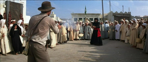 이미 오래된 영화이긴 하지만 위 장면이 기억이 나서 사례를 들어본다. 인디아나 존슨 시리즈의 1편인 ⟪레이더스(1981)⟫에서 주인공의 추격신에서 추격을 방해하는 적의 일원이 나타난다. 그는 칼을 들고 주인공을 한껏 위협하여 마치 긴장감 넘치는 칼싸움이 벌어질 것 같은 상황이 연출된다. 하지만 주인공은 그와 대결 할 의지가 없이 쉽게 총을 꺼내어 허무하다 싶을 정도로 그를 제거한다.