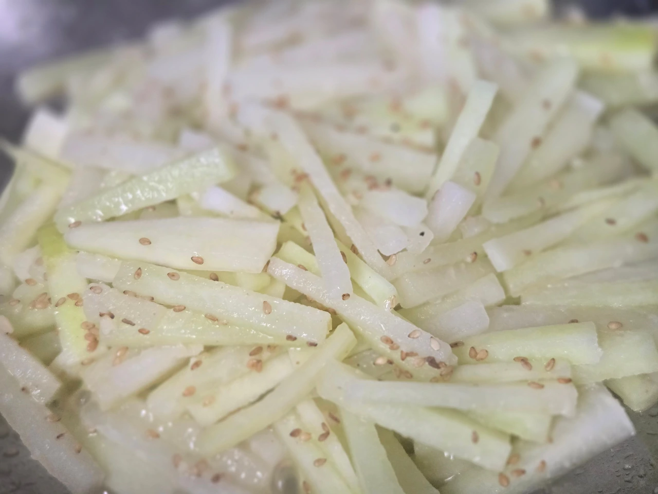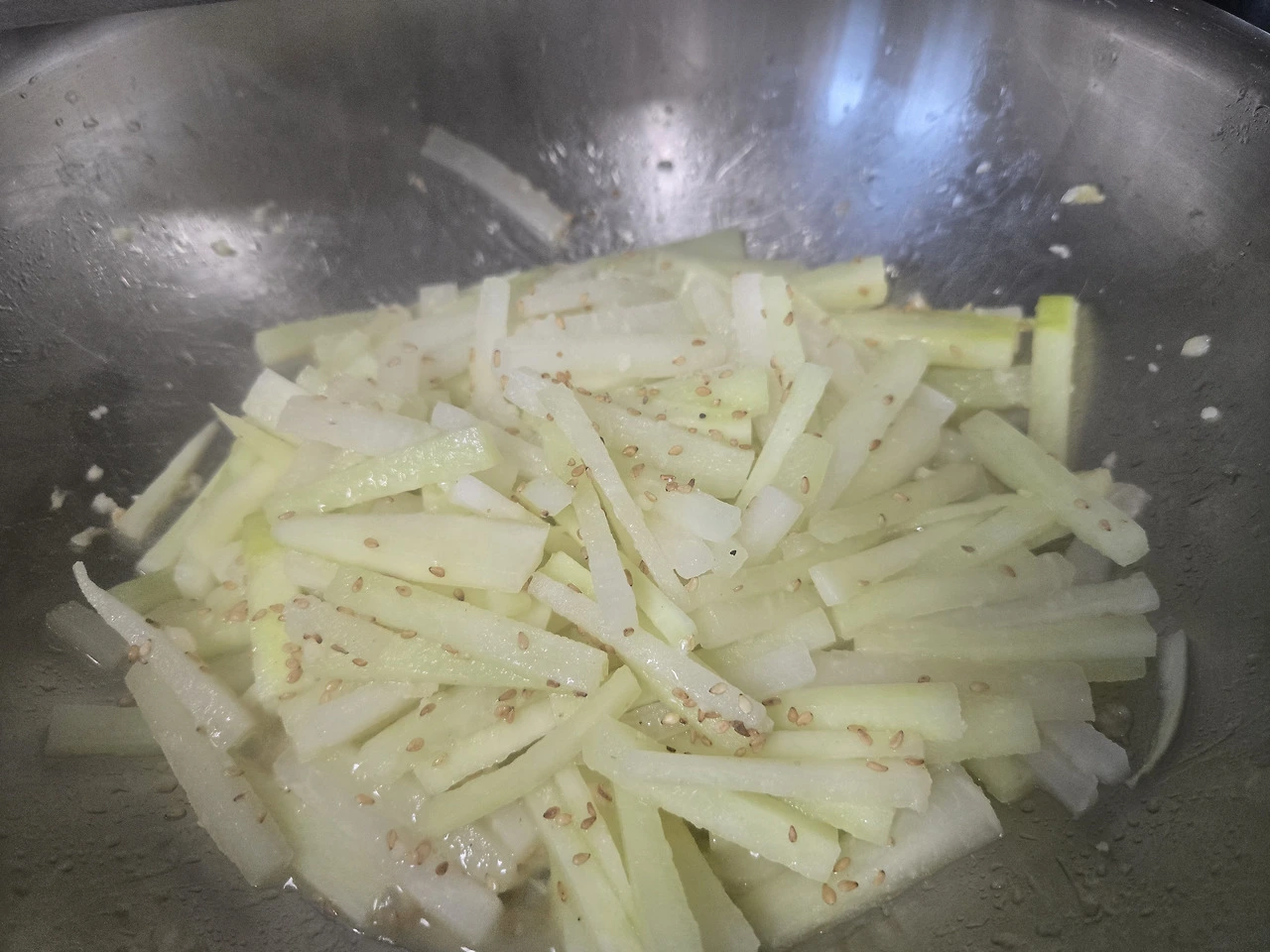 들기름에 마늘을 넣고 무를 볶다가 뚜껑을 덮어 살짝 찌듯이 익힌다. 덜 익히면 딱딱하고, 너무 익히면 설겅해져 맛이 없다. 딱딱하지도 설겅하지도 않은, 설명하기 어려운 그 중간의 식감은 오로지 감으로 맞춘다. (다른 요리의 고수들은 모르겠지만, 나는 그렇다.)